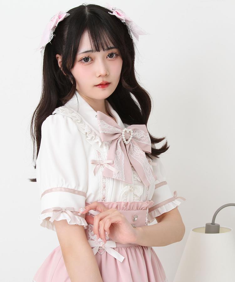 襟元の大きめリボンは取り外しが可能です。ハートパールバックルにレース重ねがポイントに♪