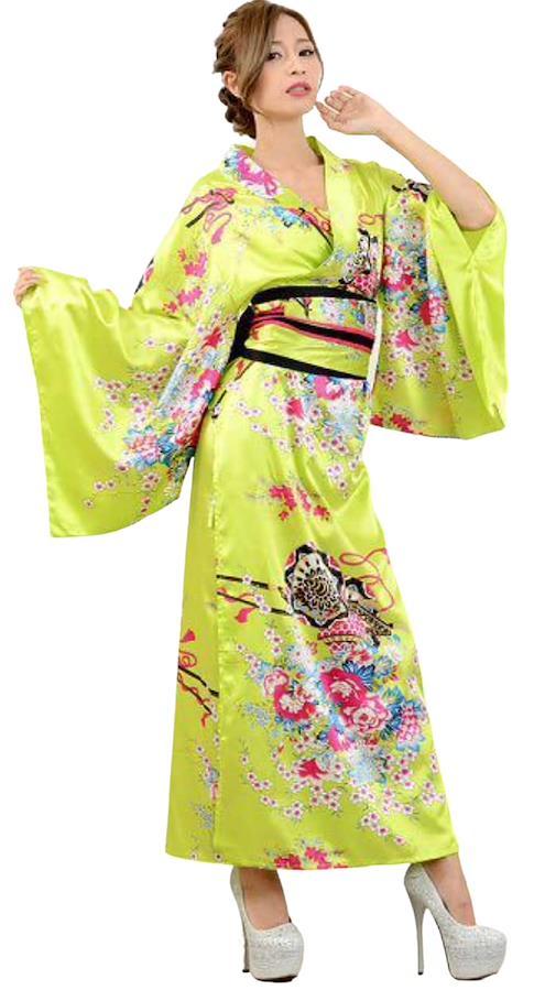 [Lady Lazy] [レディレイジー] セクシー 着物 和服 コスプレ 和装 ロング ドレス cos 大きいサイズ 制服 衣装 撮影 女装 服 cosplay かわいい 和風 豪華 お祭り 浴衣 コスチューム 桜 花柄 帯付き (イエロー)