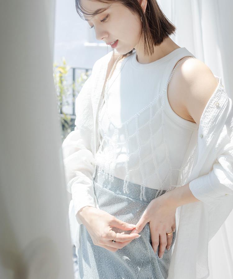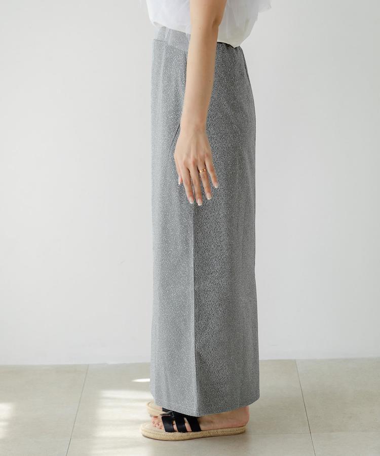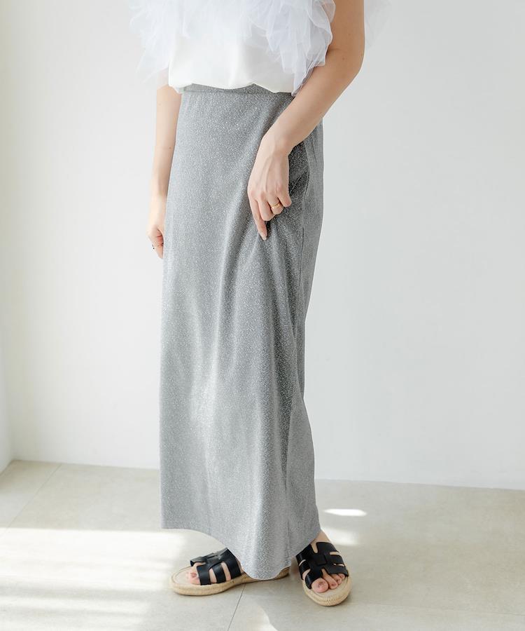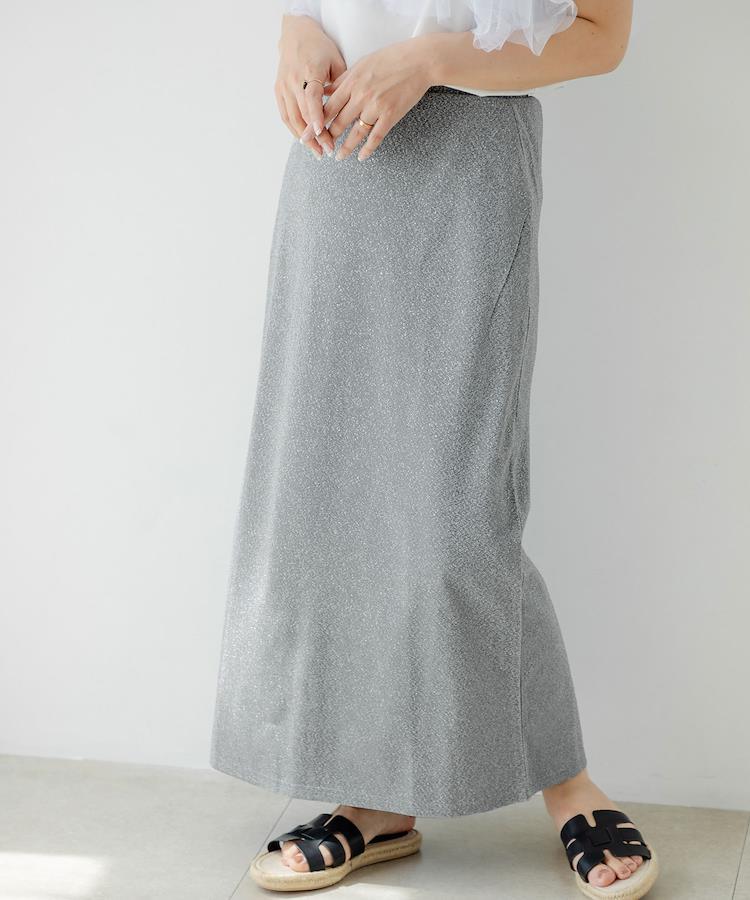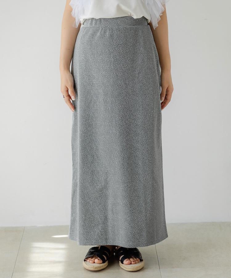キラキラとしたラメの光沢感が楽しめるナロースカート【ディティール】リラクシーな履き心地のカット素材で仕立てたスカート。派手すぎない程よいラメ感が上品な大人の雰囲気を演出します。フロントウエストは切替デザインになっており、バックウエストはシャーリングゴム仕様になっています。センタースリット入りで足捌きも文句なし。縦ラインを強調し細見え効果抜群のナローラインに、程よくゆとりを持たせたサイジングで体型カバー効果も◎リラクシーな履き心地ながらも、コーデのポイントになりきれい見えする1枚です。【素材感】さらっとした表面感でシーズンレスで着用いただけます。カットソー素材なので非常に着心地がよく、デイリーに手に取りやすいアイテムです。**********************透け感:なし裏地:あり伸縮性:ややあり光沢感:あり生地の厚さ:普通**********************《生産国》中国