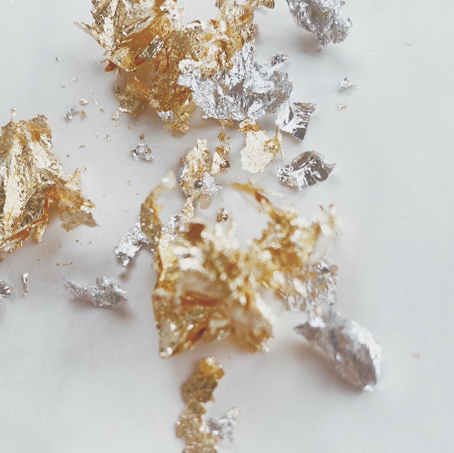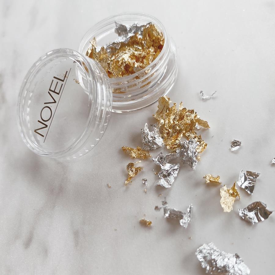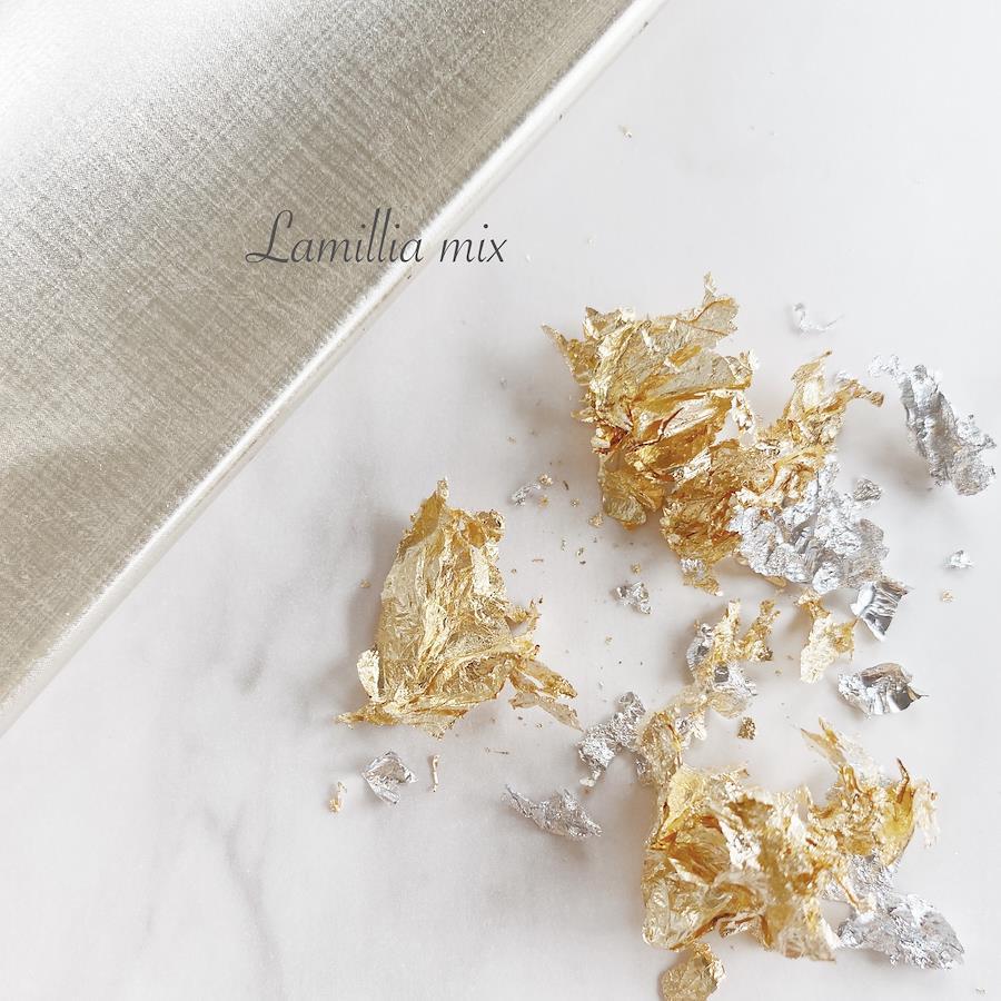 こちらは、ゴールドとシルバーの箔がミックスされたアイテムになります。ツイザー等でお好みの大きさにちぎってご使用下さい。未硬化ジェルの上にこちらを貼り付け、上からシアーカラーを重ねて頂くと奥行き感を簡単に演出することができます。