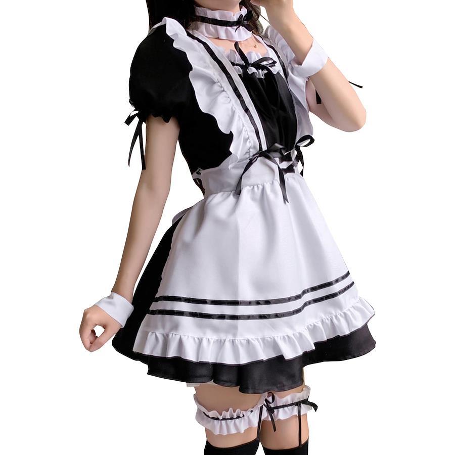 [LanBuff] メイド服 ゴスロリ ワンピース ハロウィン 仮装 レディース 可愛い ロリータ コスプレ 半袖 ニーハイソックス付き カチューシャ (S, ブラック)