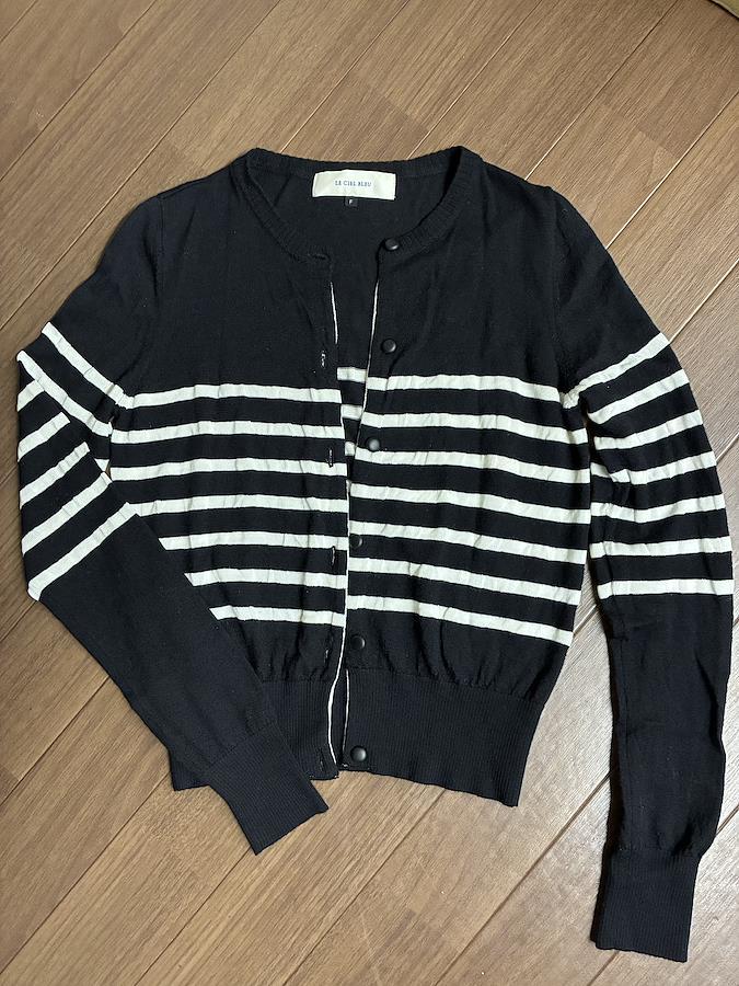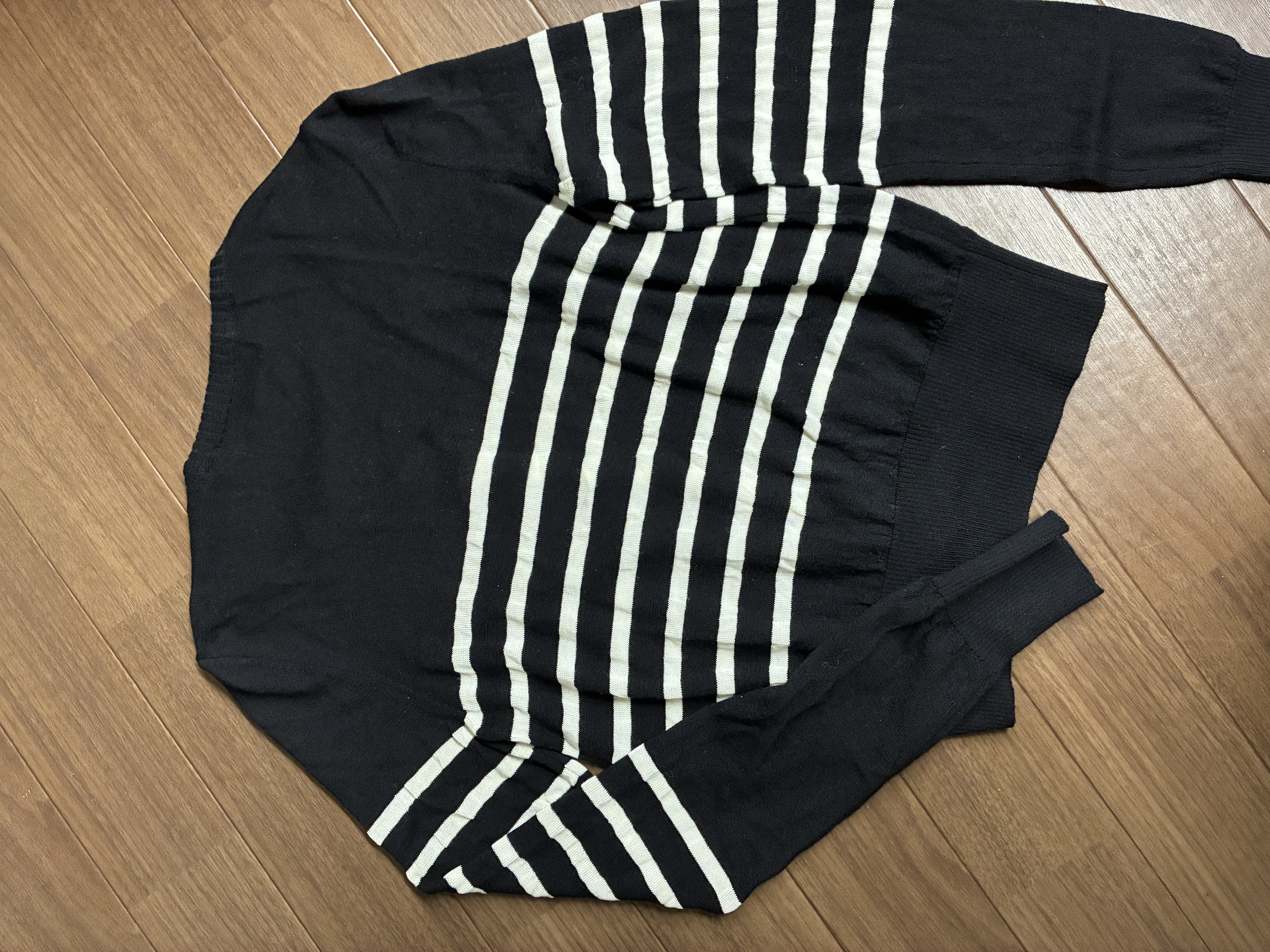 ブラックとホワイトのボーダーデザインのカーディガンで、長いお袖と丸いボタンが可愛くて購入しました。