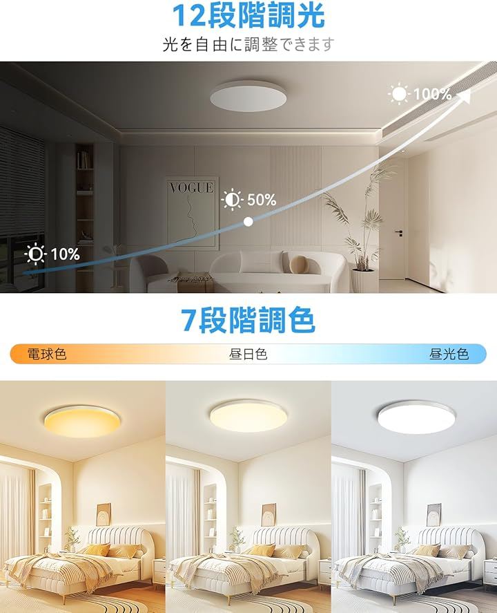 「12段階調光+7段階調色」*多段階調整:リモコンで、12段階の明るさ調整(10~100%)と7段階の色温度調整(電球色3500k~昼光色6500k)できます。