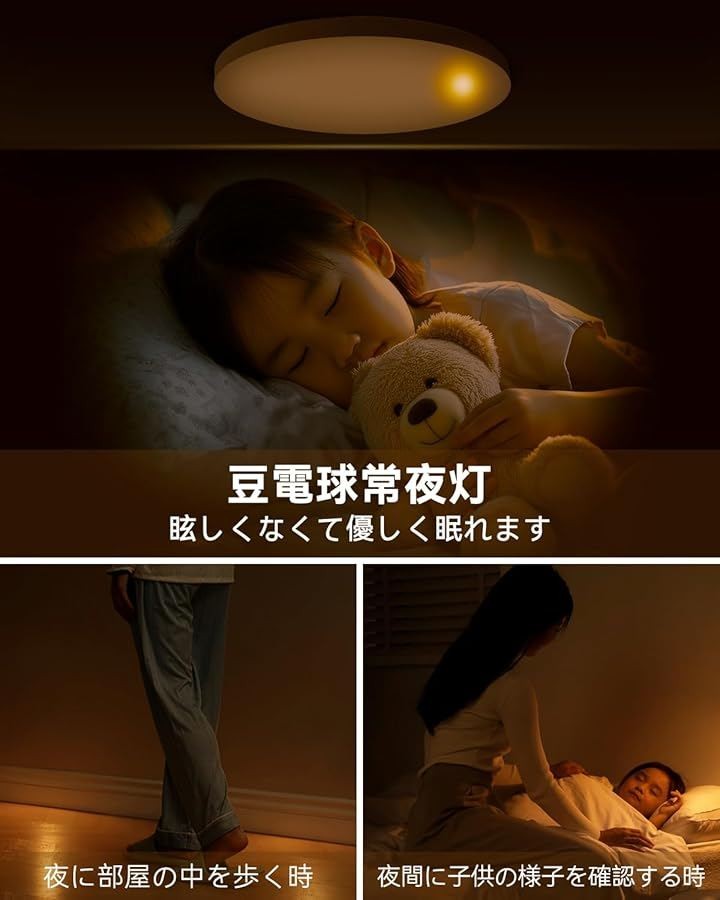 「豆電球常夜灯・記憶機能・定刻消灯」*本格的な豆電球常夜灯(1W):他の眩しい全体発光式常夜灯と違って、1点だけ発光のため、ちょうどいい感じの暗さで目への刺激がなく、付けまま寝ることに最適です。