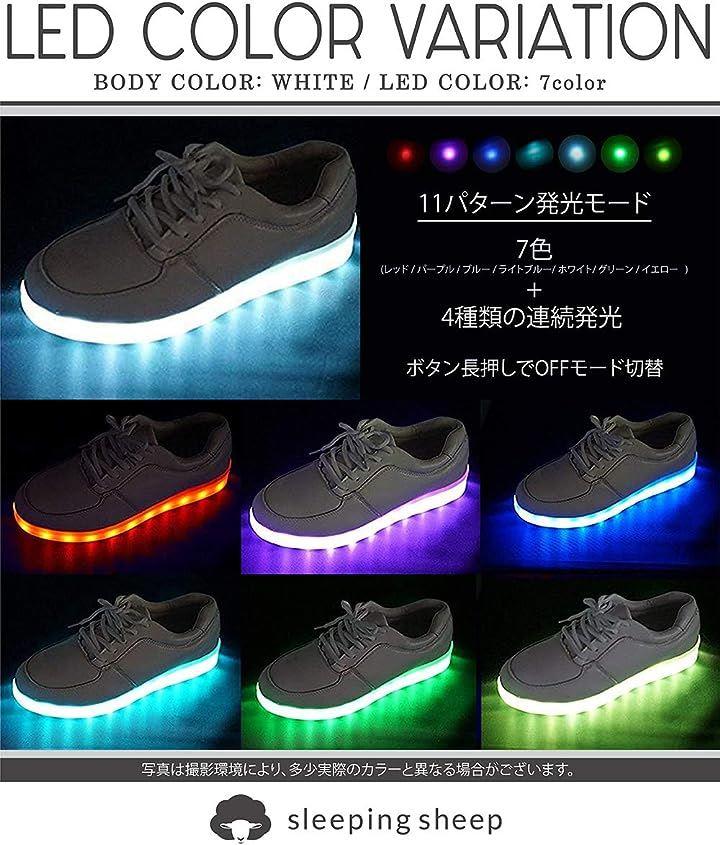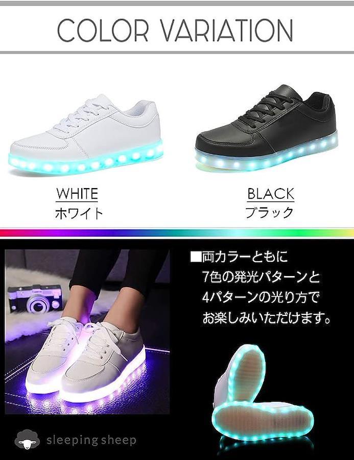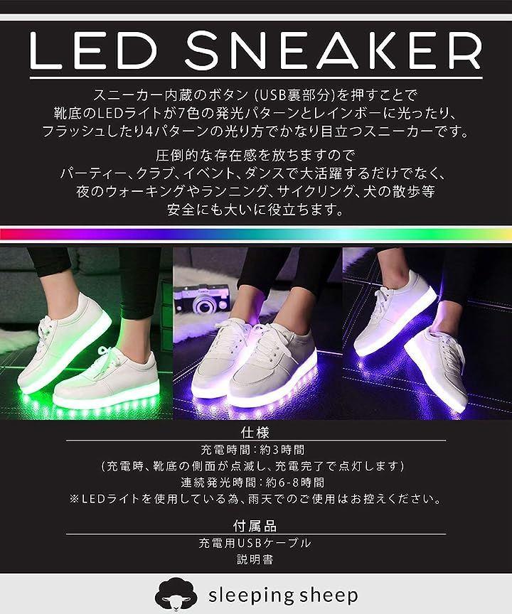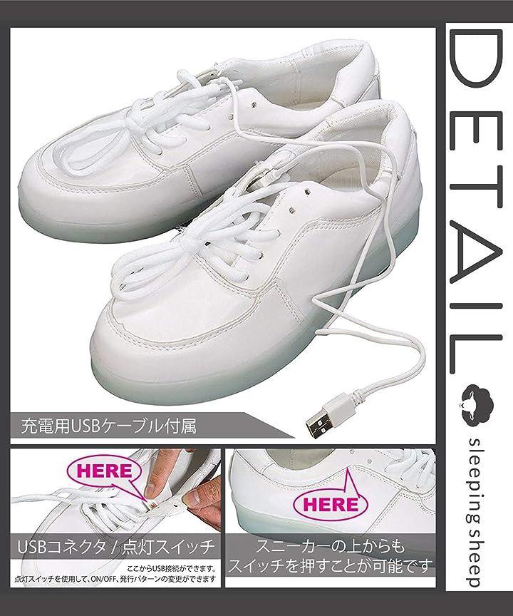 スニーカー内蔵のボタン (USB裏部分)を押すことで靴底のLEDライトが7色の発光パターンとレインボーに光ったり、フラッシュしたり4パターンの光り方でかなり目立つスニーカーです。