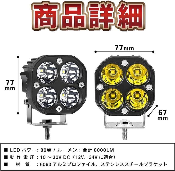 「仕様」LEDパワー:80W / ルーメン:合計8000LM / 動作電圧:10~30V DC(12V、24Vに適合)/ 色:イエロー(黄色)orホワイト(白) / 寿命:50000時間以上 / 適用温度:-40~85℃ / 寸法:3インチ / 材質:6063アルミプロファイル、ステンレススチールブラケット