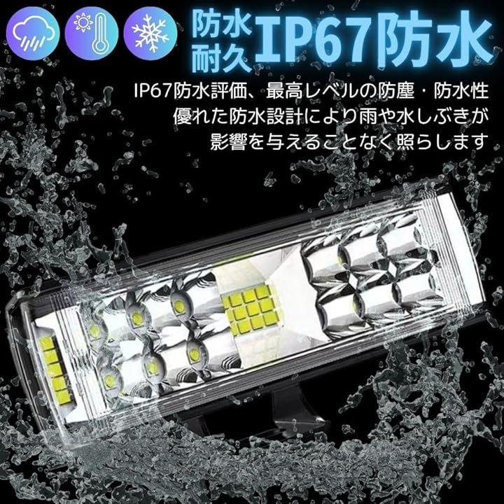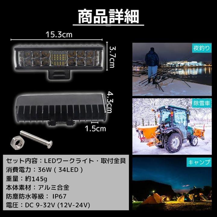 「製品仕様」(片方) 消費電力:36W ( 34LED ) , 重量:約145g/個 , 本体素材:アルミ合金 , 防塵防水等級: IP67 , 電圧:DC 9-32V (12V-24V) , 色温度:6500K, LEDチップ:3030チップ34枚 / 本体サイズ(約):約15.3cmx約3.7cmx約4.3cm/個 / セット内容:LEDワークライト 取付金具