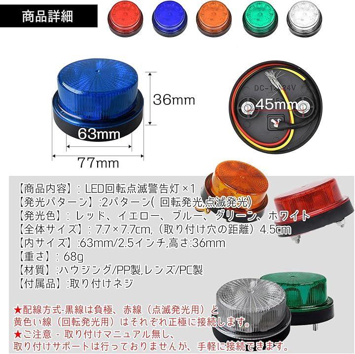 「商品内容」: LED回転点滅警告灯x1「発光パターン」:2パターン( 回転発光,点滅発光)「発光色」: レッド、イエロー、ブルー、グリーン、ホワイト