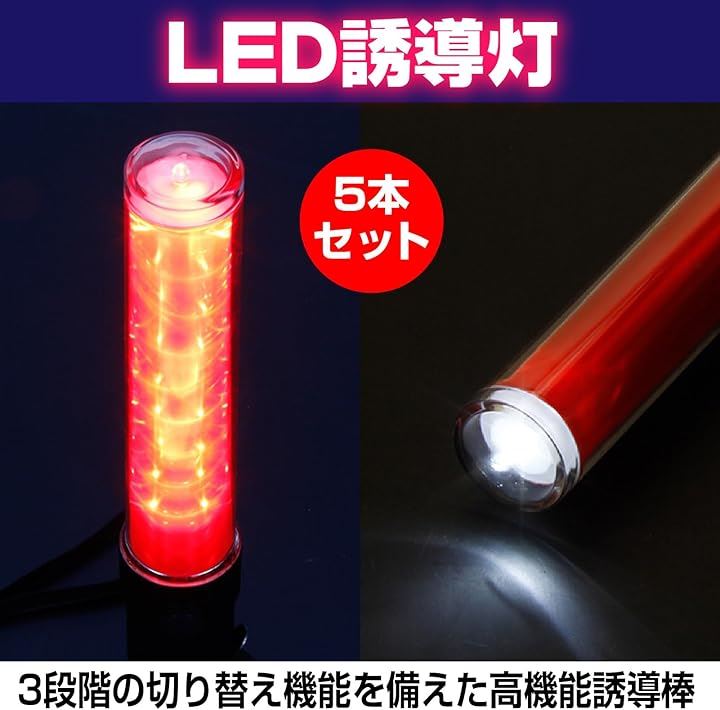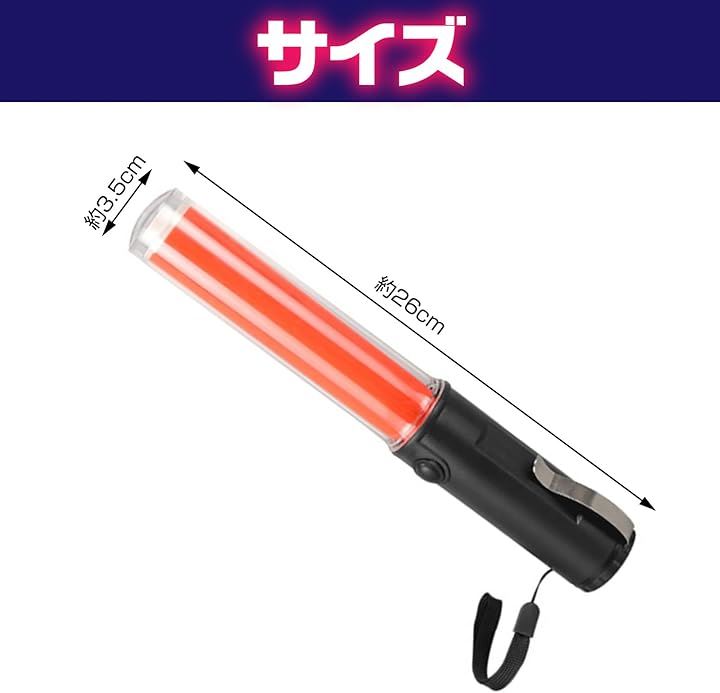 「LED 誘導棒 仕様」 *サイズ:約長さ26x直径3.5cm *電源:単3電池3本(別売) *カラー:レッド *内容:5本セット *モニターの環境により、色の見え方に若干差が生じる場合がございます。