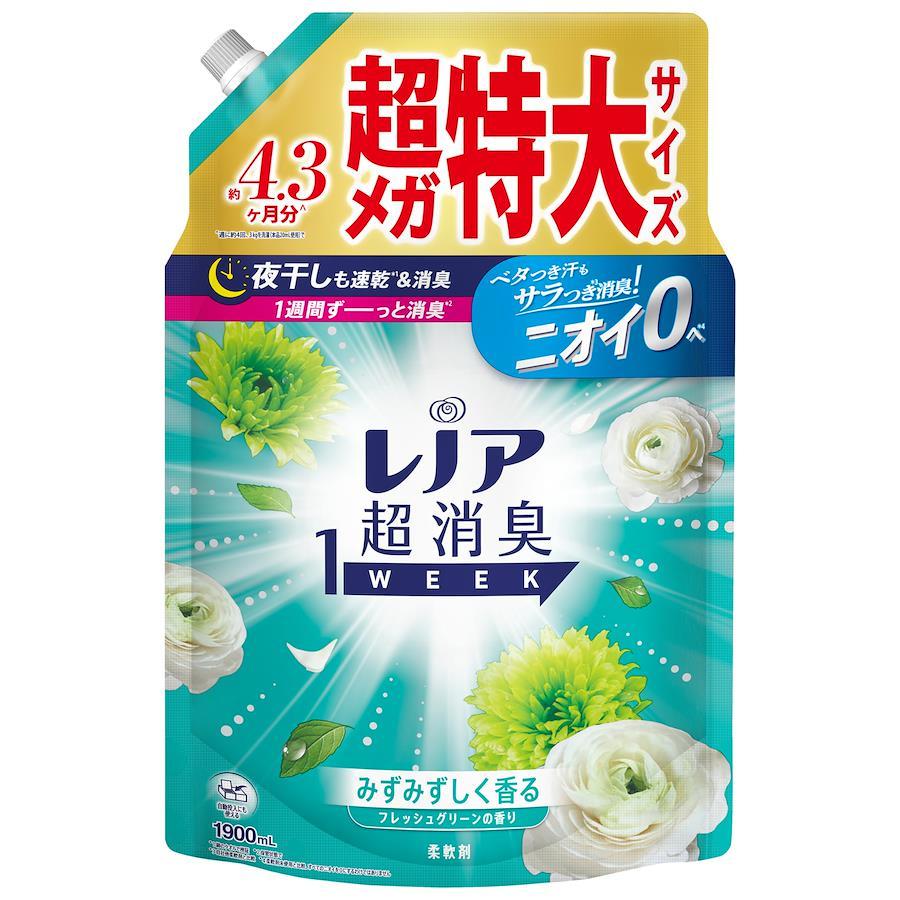 *1 綿のタオルで検証 *2 保管状態で *3 自社他柔軟剤と比較 *4 柔軟剤未使用と比較。すべてのニオイを0にするわけではありません *5 静電気を防ぐ効果による *6 すべての菌の増殖を抑えるわけではありません 新しくなったレノア超消臭1weekは、汗をかいた時のニオイはもちろん、ベタつきまで防げるようになりました(*1)。汗をかいてもさらっと吸収して速乾(*1)。しかも、何度汗をかいてもニオイ0へ(*2) *1 自社他柔軟剤と比較。 *2 柔軟剤未使用と比較。すべてのニオイを0にするわけではありません。 レノア超消臭1WEEKは、80%以上の消費者が実感した、1週間ずーっと続く消臭力(*1)。 かけっぱなしの洗面所のタオルや、ニオイが気になるけれど毎日は洗えない、シーツや枕カバーまで、1週間ずーっと爽やか(*1)。 *1 保管状態で レノアの消臭系柔軟剤は、みなさんのお洗濯のニオイ問題やお悩みを解決すべく、無臭化テクノロジーや1週間(*1)ずーっと続く消臭技術など、消臭効果に関する研究を重ねて来ました。おかげさまで、防臭タイプ柔軟剤の中で売上No.1。 *1 保管状態で レノア超消臭なら、夜干しでも速乾(*1)&消臭。消臭成分が浸透、夜の間にじっくり消臭するから、夜干しなのに、天日干し以上のさわやかさに。 *1 綿のタオルで検証。 選べる6種類の香り。 お求めの消臭力、香りに合わせて、家族で使える6種類の香りをご用意しています。フレッシュグリーンの香りは、みずみずしい、王道のグリーンの香り。 レノアの柔軟剤は、ドラム式洗濯機や自動投入洗濯機でもお使いいただけます!詳細の使用方法や使用量は、製品裏の説明をご覧ください。