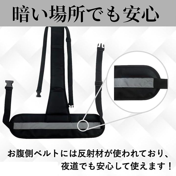 反射材付きで夜間も安心 腹部パッドの前面に反射素材を採用。