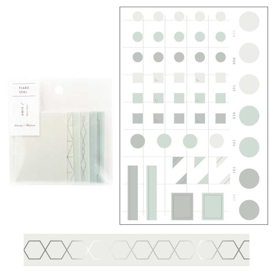 マスキングテープ:5mm幅・長さ5mシール(マンスリーシート):W102×H150mmフレークシール:W50×H70mm・6種各5枚