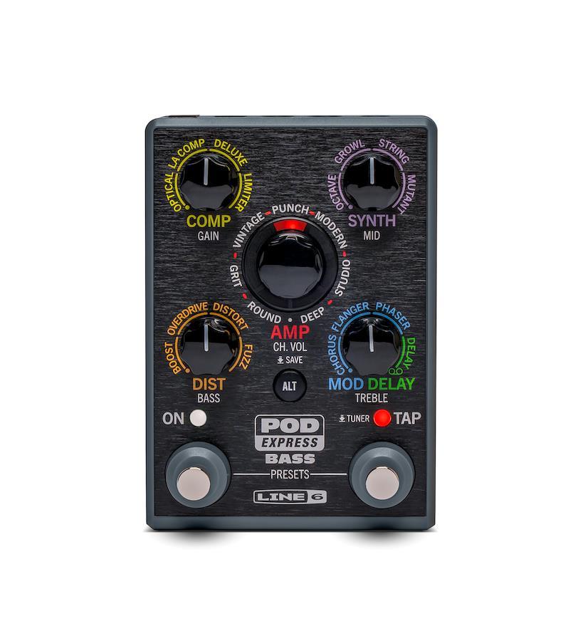 POD Express Guitar、POD Express Bassは?常にコンパクトな筐体に、?い評価を得ているHXプロセッサー・ファミリーから継承した7種類のアンプ/キャビネット、ルーパーを含む17種類のエフェクトを搭載したアンプ/エフェクト・プロセッサーです。 ■コンパクトな筐体とHXファミリー・プロセッサーから継承したアンプ/エフェクト POD Express Guitar、POD Express Bassには、 ?い評価を得ているHXプロセッサー・ファミリーから から継承したモデルが搭載されており、優れたサウンド・クオリティを実現します。これらには、それぞれ7種類のアンプ/キャビネット、ルーパーを含む17種類のエフェクトが含まれます。 ■極限までシンプルを追求したユーザーインターフェース POD Express Guitar、POD Express Bassのインターフェースは?常にシンプルです。中央のエンコーダーでアンプを選択し、エフェクトは対応するノブを回すだけで使?できます。中央のノブの周りには7つのセグメントに分割されたマルチカラーLEDが点灯し、さまざまなパラメーター機能のステータスを確認できます。 ■ギター/ベースを演奏したいときにすぐに使?できる POD Express Guitar、POD Express Bassは3本の単三電池(付属)またはオプションの9V電源アダプターで動作します。アンプ/キャビネットとエフェクトに加え、チューナー、ノイズゲート、ヘッドフォン出?を装備しており、ギター/ベースとPOD Express Guitar / POD Express Bass があれば?宅で気軽にギター/ベースの演奏を楽しめます。 ■外形?法?92 mm(W) x 130 mm(D) x 56 mm(H) 重量:350g シンプルな操作性で素早く簡単にトーンを作成可能 HXクオリティの優れたサウンドとフィール 7種類のアンプ、7種類のキャビネット、ルーパーを含む17種類のエフェクト ステレオ・メイン出?、ステレオ・ヘッドフォン出?