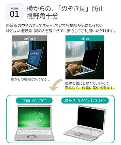 ? [プライバシー保護] 視野角 60度、正面から見れると画面はクリアでも、隣の席からは真っ暗に映る偏光性を有する「覗き見防止フィルター」です。? [ ブルーライト半減 ] 私たちが子供の頃にはなかったノートパソコンのスクリーンから発せられる青色光。 毒性の強いブルーライトは眼精疲労や体内リズムへの影響が益々懸念されています。 本製品はブルーライトを約50%低減。将来のことを考えるならブルーライトカット対応フィルムがオススメです。反射率5.8%とアンチグレアで光の映り込みもほとんどありません。? [ リバーシブル ] 表面はマットな質感で反射が少なく蛍光灯の多い場所でも見やすいアンチグレア、 裏面は反射率が高くサイドからの覗き見防止効果が大きいグレアタイプ。ご利用環境に合わせて付け替えができます。? [ 取り付け方法 ] 取り外し・取り付けが可能。 画面に段差があるフレームベゼルタイプにはスライド式またはベゼル固定方式で、段差のないフラットパネルタイプには、直張り方式で貼付けるだけ簡単です。 ※固定用プレートなどアクセサリー単体の販売もございます。 詳しくは販売店にお問合せください。? [ 対応機種 ] パナソニック レッツノート シリーズ各種: Panasonic Let's note CF-SV8、SV7、SV6 / CF-SZ6、SZ5