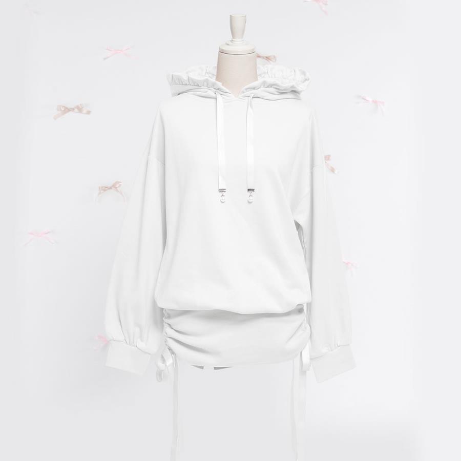 襟が選べる♪トレンドライクなスウェットミニワンピースのご紹介。【デザイン】ゆる×ピタな絶妙あざとシルエットがトレンド感抜群なスウェットワンピースです。フード襟かセーラー襟の2種類からお好みの襟タイプを選べます♪ボリューミーなお袖やゆるっと脱力感のある上半身と、ピタッと引き締めてくれるミニ丈シルエットがメリハリをつけてくれてスタイルUP効果も抜群◎スウェット生地でラフな印象なのに、可愛いらしさ+女っぽく着れちゃいます♪パーカーのリボン先にはパールチャームがついているので、コーデのワンポイントに◎伸縮性のある生地なので、被りで着用いただける仕様です。スカートのサイドドロスト部分はお好みでクシュっと感を調整して頂けます。