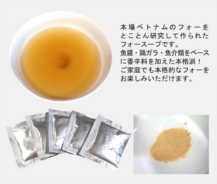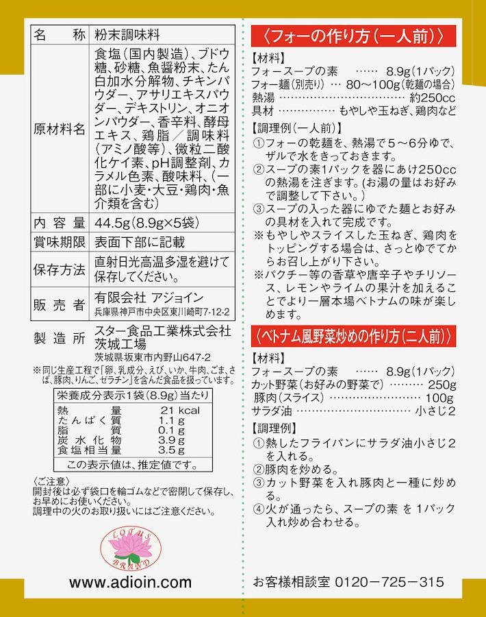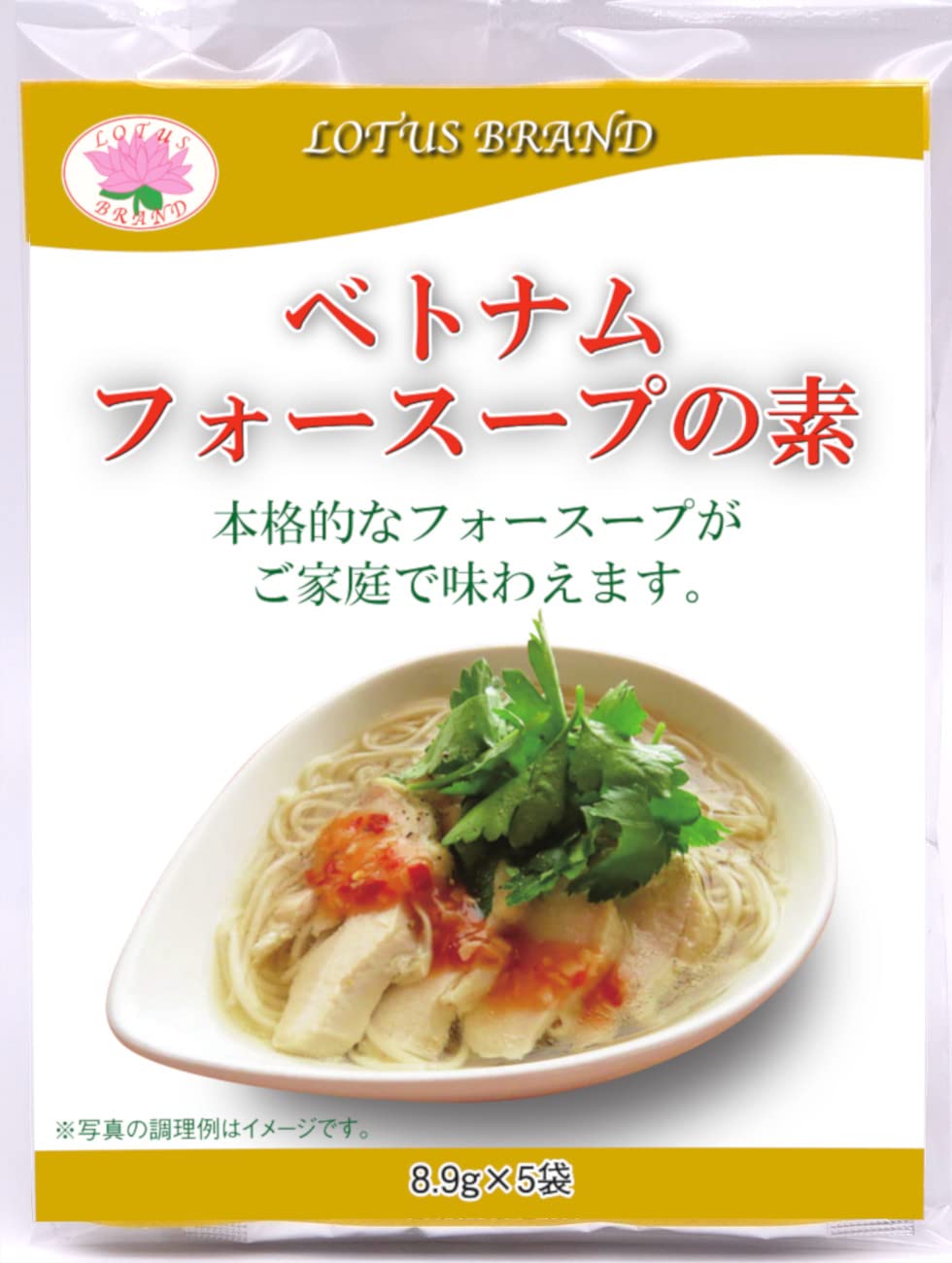 【商品特徴】お湯(250ml)をそそぐだけでフォースープの出来上がり。ご家庭でも簡単に本格的なフォーをお楽しみいただけます。1食ずつ袋に入っていますので、使いやすく簡単です。魚醤・鶏ガラ・魚介類をベースに香辛料で整えたPHO GAスープとなっています。(辛くありません。ご安心ください。)【原材料名】食塩(国内製造)、ブドウ糖、砂糖、魚醤粉末、たん白加水分解物、チキンパウダー、アサリエキスパウダー、デキストリン、オニオンパウダー、香辛料、酵母エキス、鶏脂/調味料(アミノ酸等)、微粒二酸化ケイ素、pH調整剤、カラメル色素、酸味料、(一部に小麦・大豆・鶏肉・魚介類を含む)【内容量】44.5g(8.9g×5袋) 【原産国】日本 【アレルゲン】小麦、大豆、魚介類【使用例】・フォーフォー乾麺を茹で、軽く水洗いしてざるに上げます。器にスープの素を入れ、熱湯250mlを注ぐ。茹でた麺を入れ、お好みの具材を乗せて出来上がり。・ベトナム風野菜炒め、炒飯、唐揚げ味付けはこれひとつでOK。下味に使うだけでベトナム料理に早変わり。