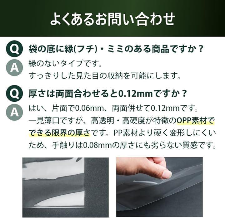 一見薄く見えますが、高透明・高硬度が特徴の高品質OPP素材を採用し、一般には流通しない、工場で製造できる限界の厚さで仕上げました。