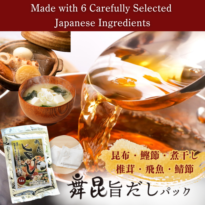 ●6種類の旨み素材の相乗効果焼津の本枯れ鰹節・鯖節、長崎の焼きあご、利尻の天然昆布、宮崎の原木栽培椎茸、熊本のうるめ鰯節の旨みをブレンドしました。