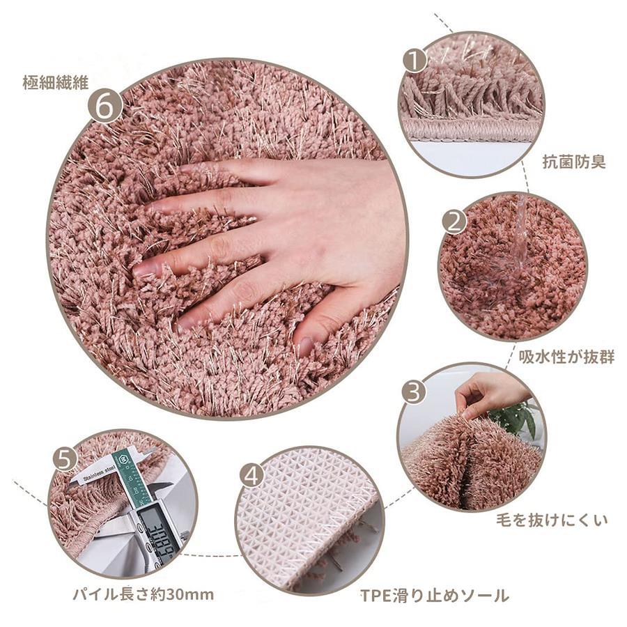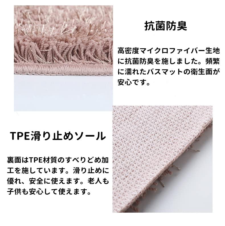 【素材】極細繊維+TPE滑り止めソール【ふわふわ】バスマットは濃密なマイクロファイバー素材(超極細繊維)を採用し、抜群の通気性を持ち、細菌の増殖を抑制できます。毛足の長いふわふわ触りごこちが気持ちがいいです。【滑り止め加工】裏面にはTPE素材のすべり止め加工がされて防水力、吸着力アップ。滑りがすくなってしまうトイレやキッチンなどの水回りでも安心してお使いいただけます。【洗濯方法】手洗いでもいいが、洗濯機で丸洗い可能です。洗濯機での丸洗いはクリーニングネットをご使用ください。【場所】バスマット、洗面所マット、玄関マット、足拭きマット、お風呂マット、ソファーマット、インテリアマット、カーペット、ラグマットなどの多目的