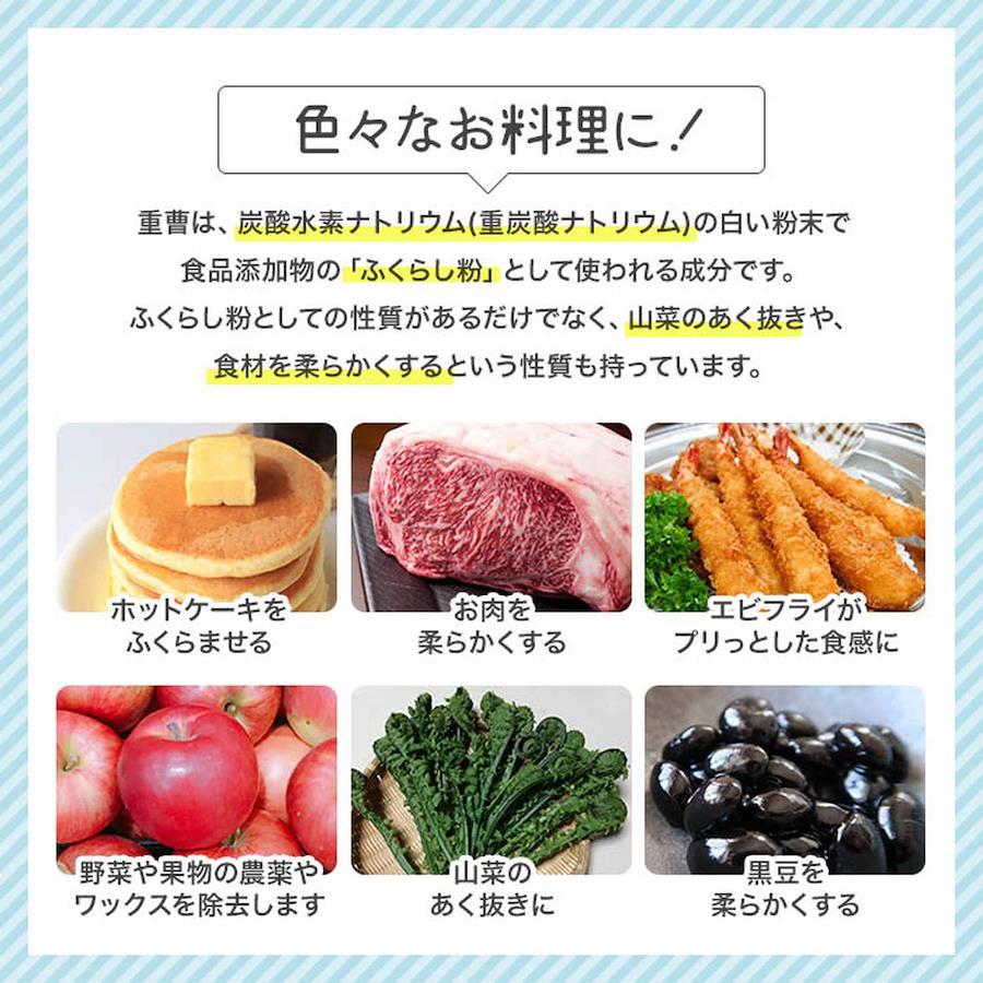 ?重曹でお菓子作りやお料理にも:パンやケーキ、お菓子の粉としてご利用いただける重曹です。饅頭やどら焼きなど和菓子などにも幅広くご利用いただけます。 アク抜き、ツヤ出し、堅いものの煮物などに。適量の使用でお料理を美味しく仕上げます。