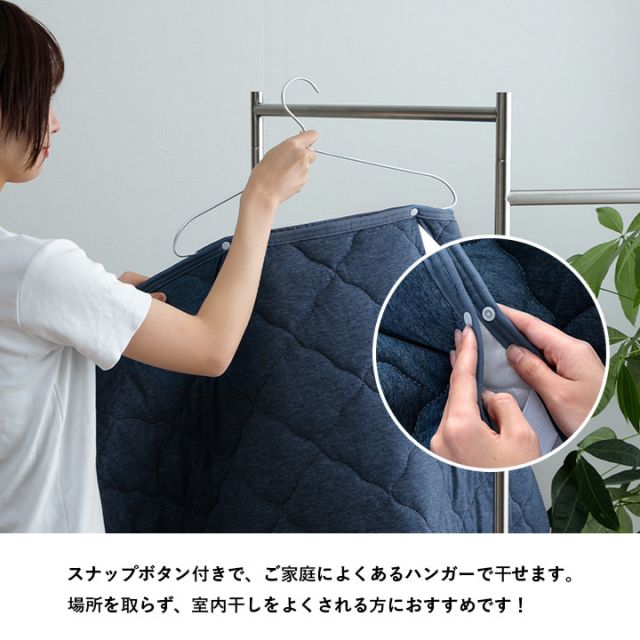 "スナップボタン付きでハンガーで干せ、場所を取らず、室内干しの方におすすめ。ニット素材でまるで肌着のような柔らかな肌触りが特徴です。4隅ずれ防止バンド付き、付け外し簡単。洗濯ができますので、清潔を保ちます。