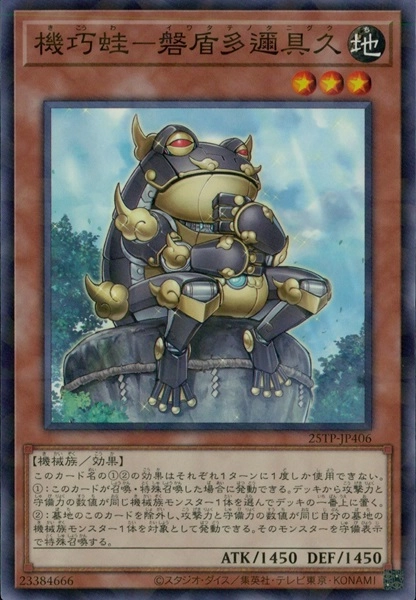 ■搭載パック:[25TP]トーナメントパック2025Vol.4■収録:プロモーションカード■■レアリティ:ノーマルパラレル■種類:効果モンスター■属性:地■種族:機械族■星(レベル、ランク):3■攻撃力:1450■守備力:1450■リンク:‐■リンク方向:‐■ペンデュラムレフト:‐■ペンデュラムライト:‐■■シリーズ:トーナメントパック■効果テキスト:このカード名の①②の効果はそれぞれ1ターンに1度しか使用できない。①:このカードが召喚・特殊召喚した場合に発動できる。デッキから攻撃力と守備力の数値が同じ機械族モンスター1体を選んでデッキの一番上に置く。②:墓地のこのカードを除外し、攻撃力と守備力の数値が同じ自分の墓地の機械族モンスター1体を対象として発動できる。そのモンスターを守備表示で特殊召喚する。■ペンデュラムテキスト:‐