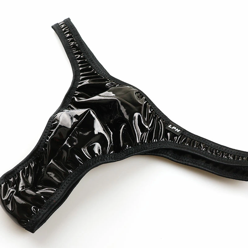 独特の光沢と艶やかな外観が魅力になり滑らかで冷たい手触りが特徴のポリウレタンやPVCでコーティングされ高級感のある見た目のエナメル生地を使用したTバックビキニになります。フロントハーフシームで男性自身を収めやすくした男性用下着になります。