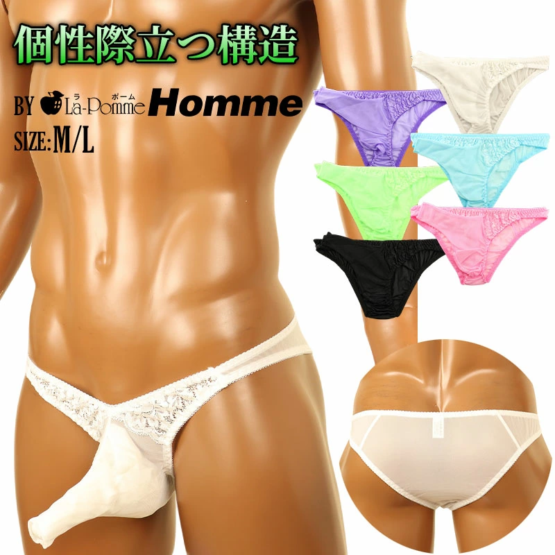 繊細なレースデザインが軽やかな印象を与え、洗練された雰囲気を演出したフルバックになります。フロントは特徴的な貫通型のゾウさんタイプを採用。遊び心のある構造でありながら、独立性を持たせた設計により、個性的なシルエットと快適な着用感を両立しています。デザイン性とユニークさを楽しみたい方におすすめの、存在感あるメンズランジェリーです。Mサイズ:股上置き寸 約14.5cm。Lサイズ:股上置き寸 約15.5cm。
