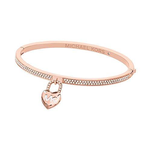 Michael Korsの洗練されたローズゴールドトーンのヒンジブレスレットは、パヴェのディテール、ハートロックチャームが特徴で、プッシュボタンで開閉します。
