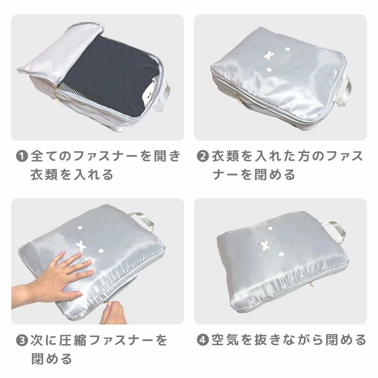 【圧縮ポーチ】ファスナーを閉めるだけで簡単に圧縮できる、ミッフィーの圧縮ポーチ。旅行や収納時にかさばる衣類もすっきりコンパクトに!持ち手付きだからキャリーやバッグにも入れやすい◎シンプルでかわいいデザインで、子供から大人まで使える便利アイテムです♪