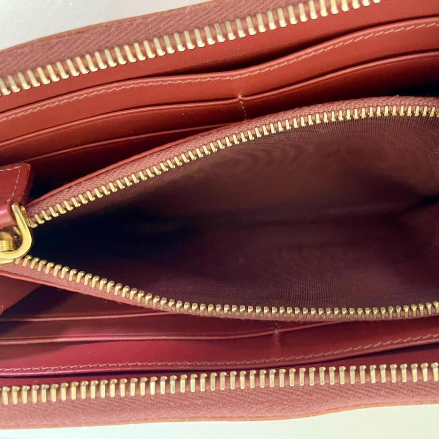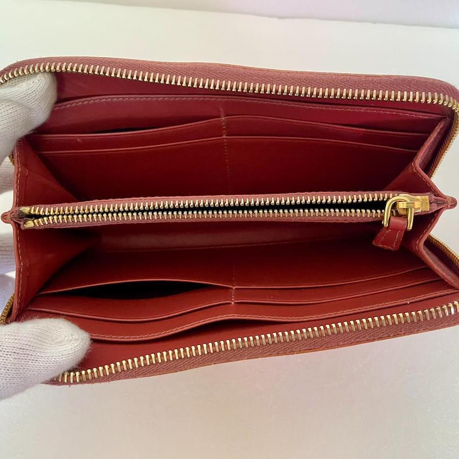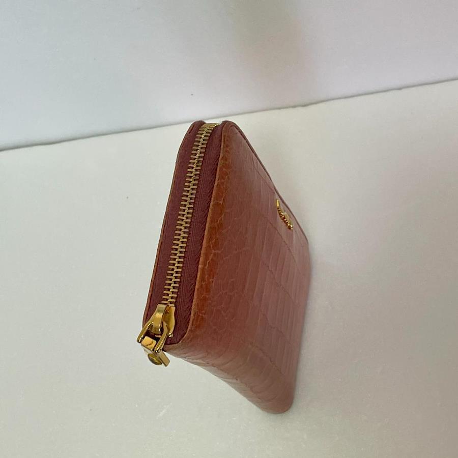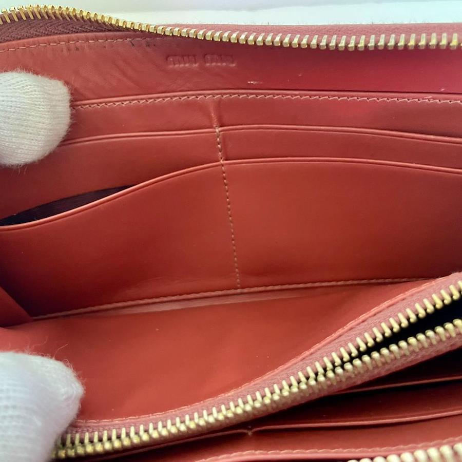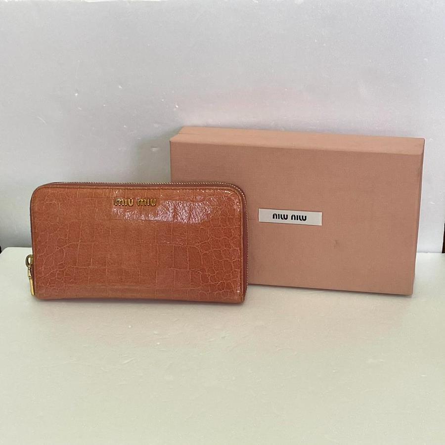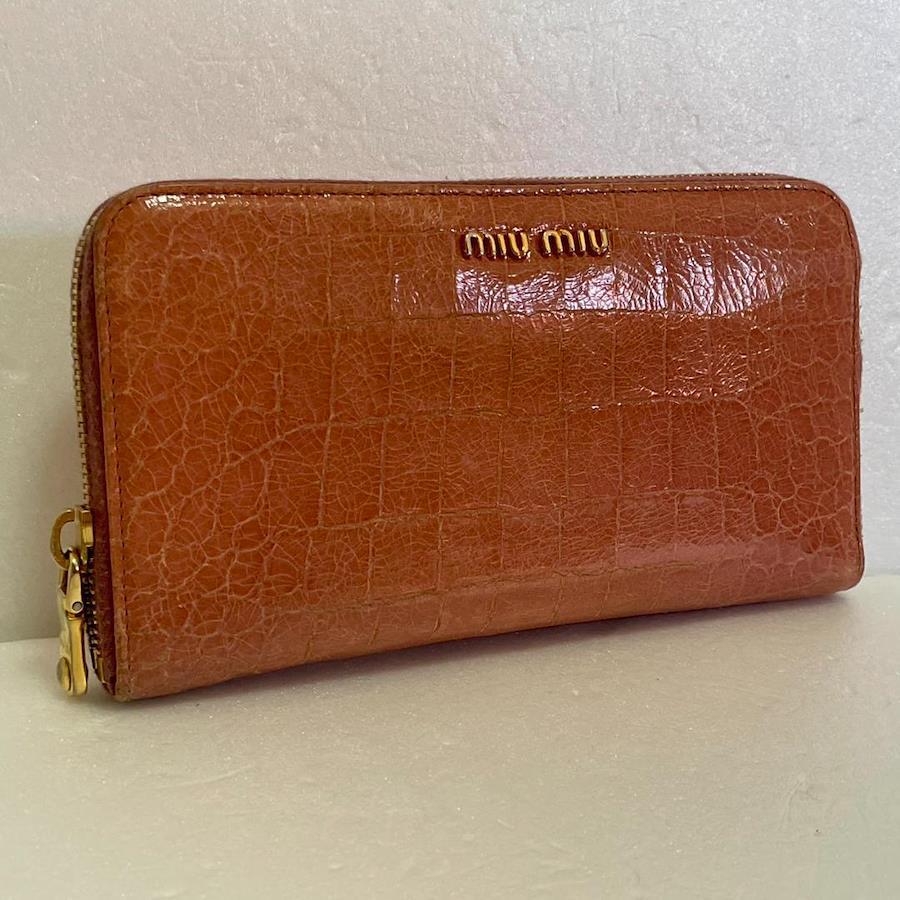 - ブランド: miu miu- 色: オレンジ- 素材: レザー- 内部構造: ファスナー付きポケット、カードスロットあり- デザイン: クロコダイル型押し