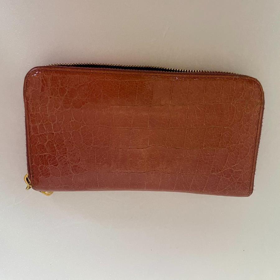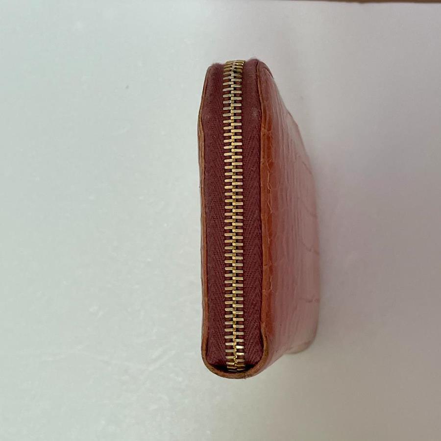 ☆こちらの商品はUSED品ですので新品や未使用品をお求めの方はご遠慮ください。オレンジのクロコダイル型押しレザー長財布、ファスナー付きポケットとカードスロット付き。