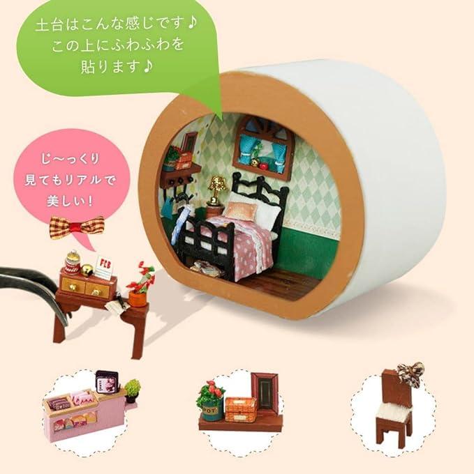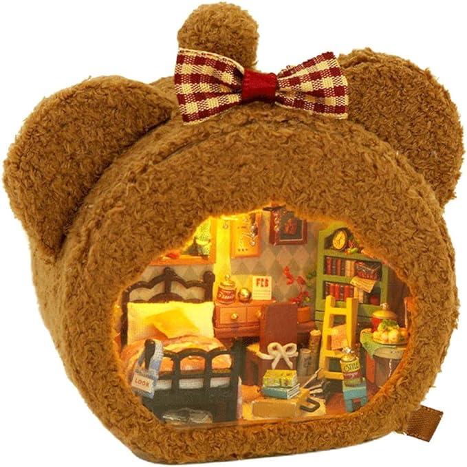 ■商品名moin moin ドールハウス ミニチュア 手作りキット セット 【 英語説明書 】 ふわふわ アニマル フェイス ハウス くま リボン テディベア ブラウン 初心者 手のひらサイズ 作る インテリア LEDライト + 製作ツール 2303dh381