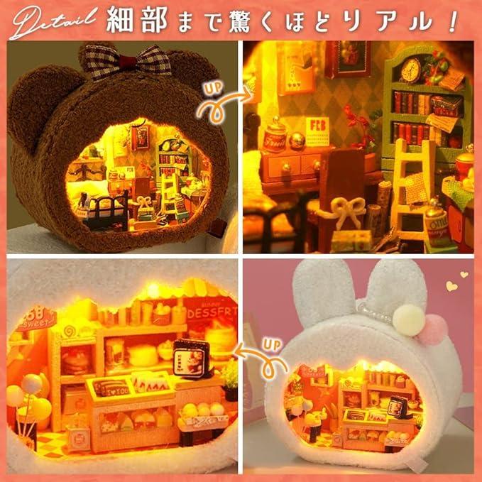 ■商品説明ふわっふわのくまさんとうさぎさんの形の面白いドールハウス手作りキット。手のひらに収まる程度のちいさ~いサイズ。作成後にはもふもふのかわいいインテリアになります♪ 【完成サイズ】 幅9×高さ8.3×奥行5.5cm 【サイズ分類】 超小型 【制作時間】 12時間以内 【制作難易度】 ★☆☆☆☆(初心者OK!簡単!) 【セット内容】 素材一式&LEDライト 【保証】:パーツ保証付。お届け後に万が一パーツが足りなかった場合、迅速に替えパーツをお送りさせて頂きます。 小さめのドールハウスなため、さっと完成させることが出来ます。「完成までにあまりに長い時間がかかるのは困るな~」とドールハウス作りに二の足を踏んでいた方にもおすすめ。日常で見慣れたビーズや、金具などがみるみるうちに小さな家具に生まれ変わる様子は感激です。 箱・説明書は英語で書かれています。初心者の方でも作って頂けるよう、説明書はフルカラーで全行程が丁寧に解説されています。輸送の都合上、外箱は多少の凹みがある可能性がございます。予めご了承くださいませ(ダメージが大きい場合には新しい箱に取り換えております) 巣ごもり中のおうち時間の新しい趣味としていかがでしょうか?熱中していると時間が経つのがあっという間です。夏休みの自由研究、バレンタイン、誕生日、クリスマス、ハロウィン、父の日、母の日などのプレゼントにもおすすめ。?もっと見る