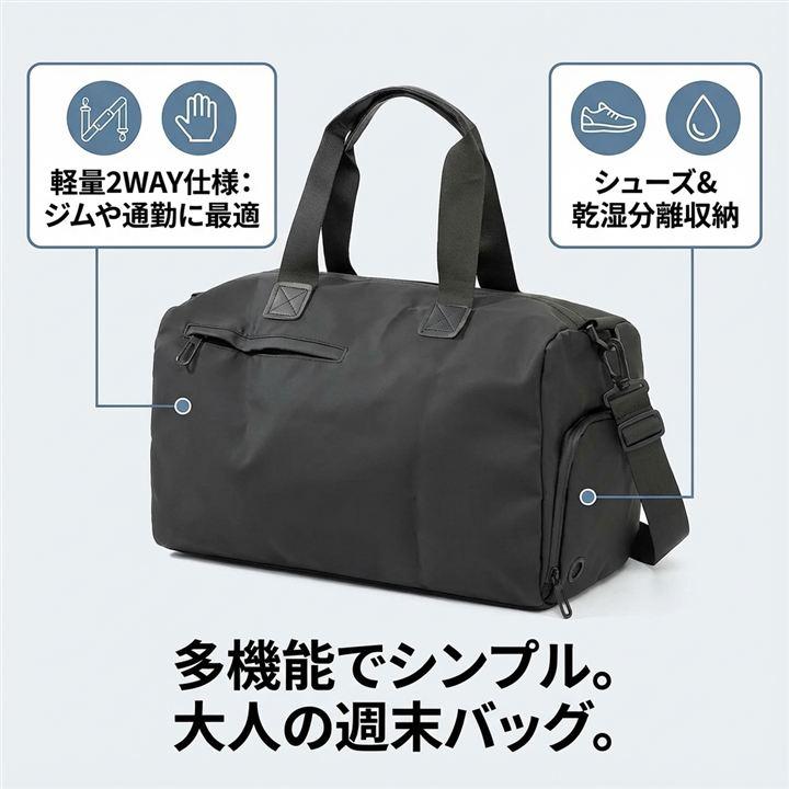 「2WAYで使えるボストンバッグ」 1泊2日旅行やジム、通勤など多用途に対応するマルチなボストンバッグ。