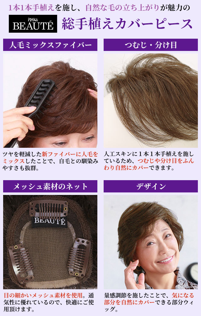 プリシラボーテ総手植えカバーピース(ヘアピース)白髪隠しやボリュームアップしたい時など部分的にカバーできるウィッグ