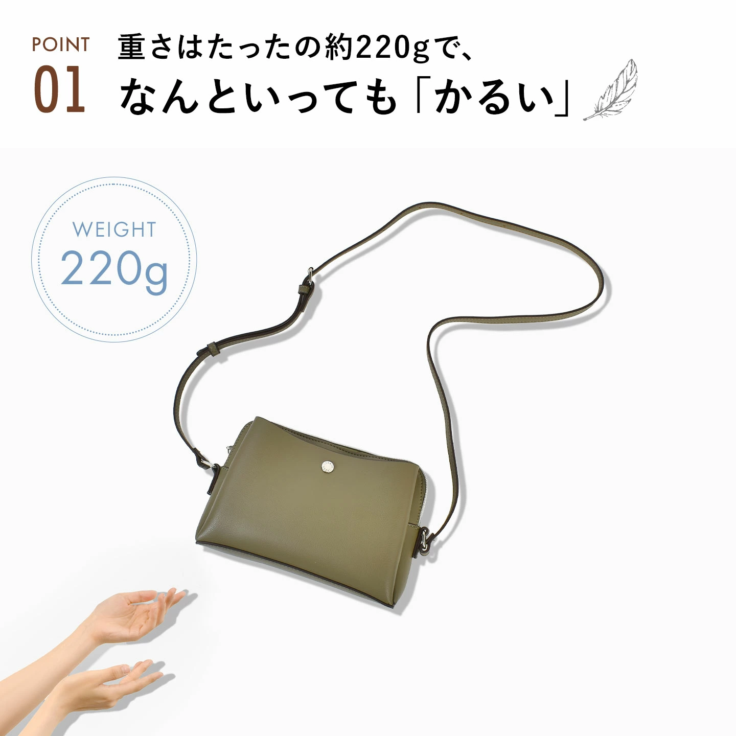 【かるいかばん 多機能ショルダーバッグ】「 オンオフで使える軽いカバン 」をコンセプトに開発した合成皮革を使用したアイテム。ほどよいハリとやわらかさがあり、本革のようなしっとりとした手触りです。重さはたったの220g。まるで持っているのを忘れそうな軽さです。カジュアルにも綺麗めにも合うシンプルなデザイン。やさしいカラーリングでコーディネートの邪魔をしません。普段使いやちょっとしたお出かけにぴったり◎