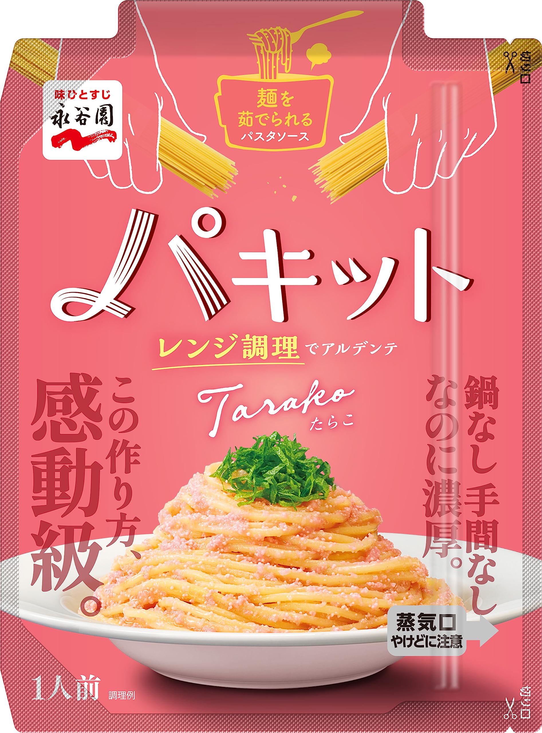 パスタソース入のパウチの中に水160mlとパスタを折って入れレンジでチンするだけで茹でたてアルデンテ食感のパスタが完成します。たらこを贅沢につかったバターのコクたっぷりの味わいです。クリーミーで濃厚なソースに仕上げました。