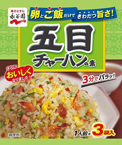 えび、鶏肉など五目の具が入った粉末タイプのチャーハンの素です。卵とご飯を用意して、フライパンで3分炒めるだけで、簡単にパラッとしたおいしいチャーハンができあがります。ねぎ香味油で、香ばしいねぎの風味が際立つ味わいに仕上げました。永谷園のロングセラー商品です。