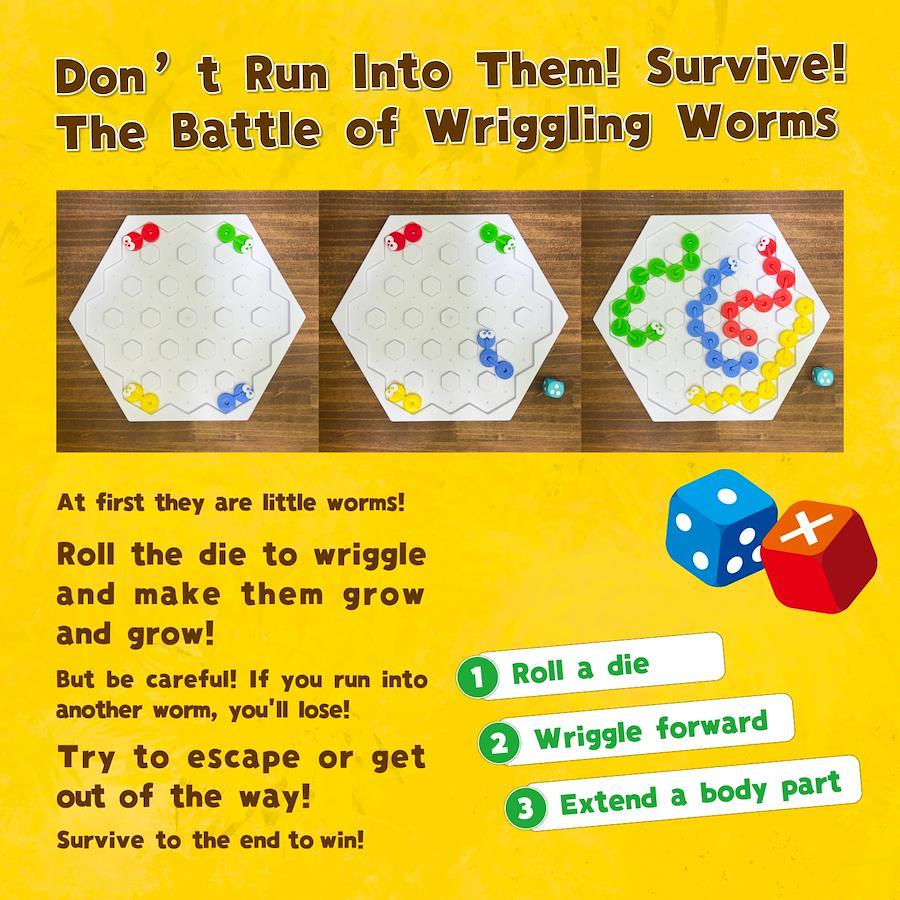 新版ワームス(ゲームマーケット秋2022発表) プレイ人数:2人?4人 プレイ時間:20分 対象年齢:8歳以上 アークライトゲーム賞2021佳作受賞作品 日本語・英語説明書付き コンポーネント:説明書(JP/EN)・ボード1点・ブロックパーツ6個・プレイヤーマーカー4枚・サイコロ2個・ワームセット4セット