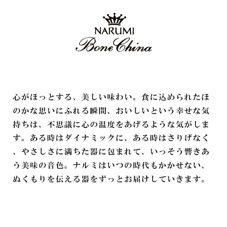 1946年創業の日本を代表するテーブルウェアブランド〈ナルミ〉心がほっとする、美しい味わい。食に込められたほのかな思いにふれる瞬間、おいしいという幸せな気持ちは、不思議に心の温度をあげるような気がします。ある時はダイナミックに、ある時はさりげなく、やさしさに満ちた器に包まれて、いっそう響きあう美味の音色。ナルミはいつの時代もかかせない、ぬくもりを伝える器をずっとお届けしていきます。ボーンチャイナの白を基調に、モダン且つシンプルなデザインとシャグリーン(鮫肌)調の表面仕上げで、落ち着きのあるテーブルウェアです。