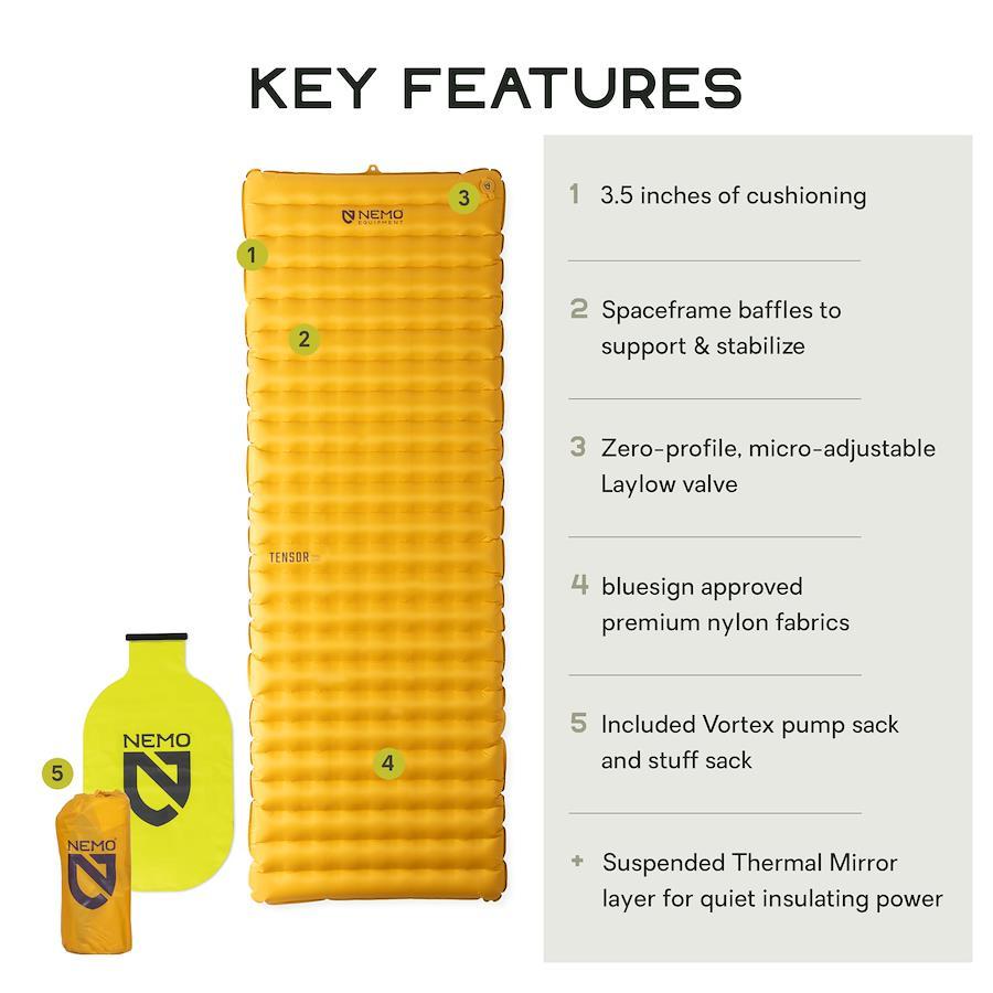 NEMOのベストセラーパッドであるテンサーの後継モデルです。 超軽量かつエアマット特有の不快なフワフワ感を排除したサポート力のある寝心地を提供するスペースフレームバッフル構造はそのままに、内部のサーマルミラー(断熱フィルム)の配置を見直すことで、従来モデルよりも断熱性を高めています。また、サーマルミラーはパッドに溶着されていないため、寝返りによるカサカサ音を最小限に抑え静かに眠ることができます。 また、静音性や厚さ9cmという安定したクッション性も兼ね備えており、バルブの素材とデザインもアップデートされたほか、本体素材をナイロン(トップの生地はbluesign?認証)に変更することで耐久性や強度を向上させることに成功しました。