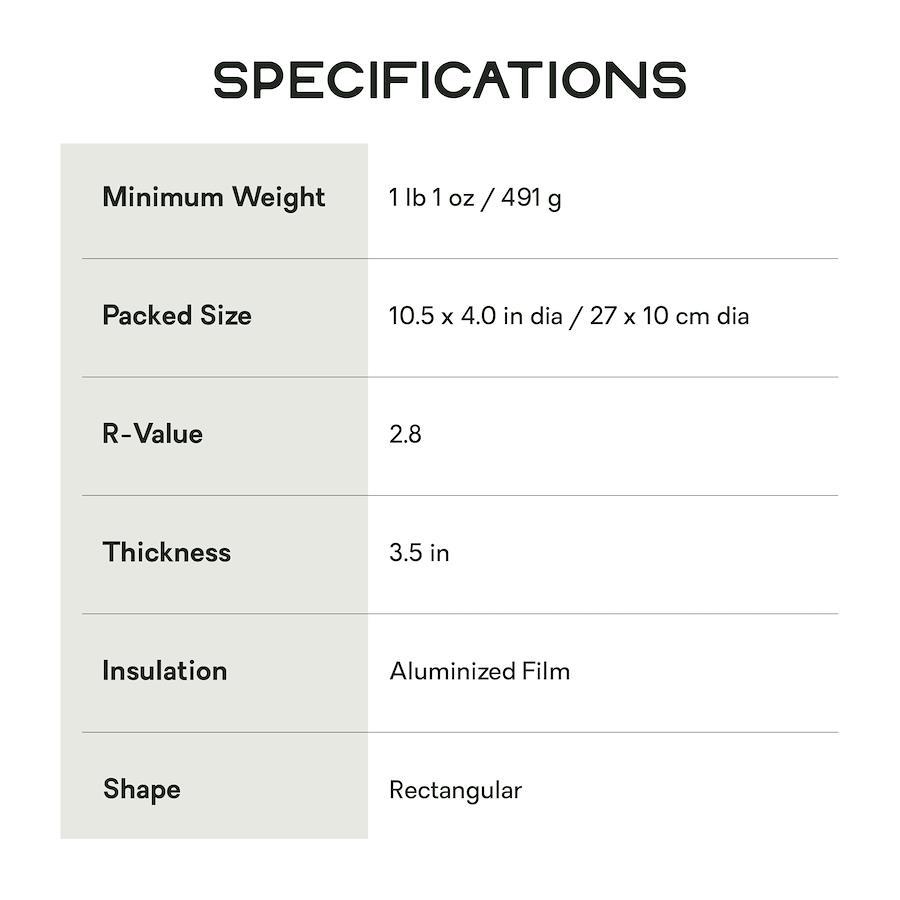 R値: 2.8 (ASTM)重量: 470gアルミナイズドフィルム x1付属品: スタッフサック、ポンプサック、コンプレッションストラップ、リペアツール