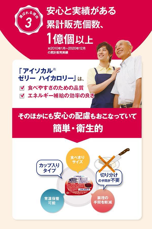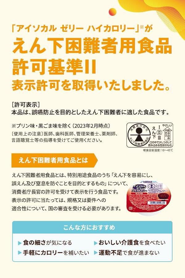 3営業日以内に発送≪新品未開封品≫:Nestle(ネスレ) アイソカル ゼリー ハイカロリー HC 黒糖風味 66g×24個入 (飲み込みやすい 高カロリー エネルギー ゼリー) ハイカロリーゼリー 栄養補助食品 介護食サイズ: 66グラム (x 24)【少量なのに高カロリー】 1個で、150kcalのエネルギーと3gの良質なたんぱく質を摂取できるハイカロリーゼリー。 食事量や食べられる量が減ってきた方にもお手軽にエネルギーアップができます。 150kcalはおかゆ1杯分(200g)程度のエネルギー、タンパク質量です。【飲み込みのしやすさに配慮】 かむ力や飲み込む力が気になる方にも配慮したハイカロリーゼリーです。 舌でつぶせる程度のやわらかさで、飲み込みもしやすいため、年齢を重ねた方や、在宅での介護でも使用されています。【医療・介護現場での実績】 ネスレは全国の医療機関や介護施設にも様々な製品を提供しています。「アイソカル ゼリー ハイカロリー」もネスレが開発・販売を行い、全国の病院や介護の現場で累計5,000万個以上ご愛用いただいております。【在宅介護にもうれしいカップタイプ】 レトルトのカップタイプのゼリーのた