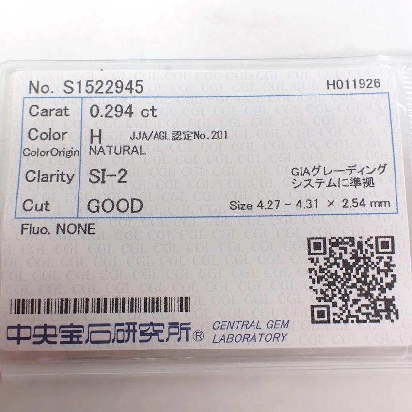 Product DetailsProduct Rank: NGemstone: DiamondCarat: 0.294 ctColor: HClarity: SI-2Cut: GOODFluorescence: NONEIncludes Central Gem Laboratory sortingProduct DetailsThis is a high-quality diamond with colorless clarity and excellent brilliance.Additional charges (tax included) for processing in platinum 900: Six-prong earrings: From +8,000 yen Six-prong pendant top: From +8,000 yen 45cm rice chain with 0.8mm slide: From +12,000 yen Six-prong ring: From +23,000 yen Please let us know if you have any other requests.Product rank [N] New or equivalent, in very good condition with no defects. [S] Almost no defects, in good condition. [A] Little signs of use. [B] Signs of use. [C] Signs of heavy use, obvious damage or stains, in need of repair. ________________________Condition: Used