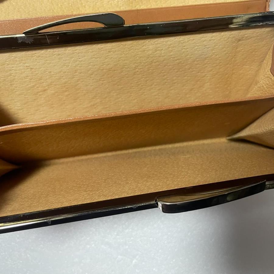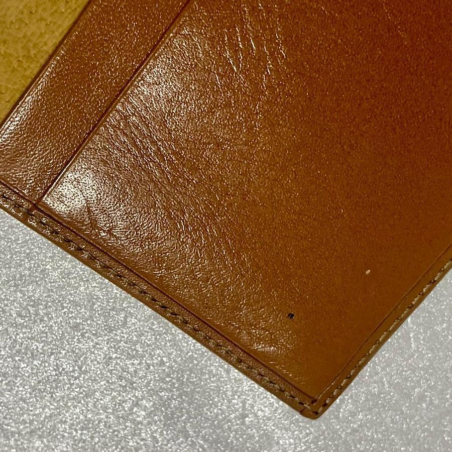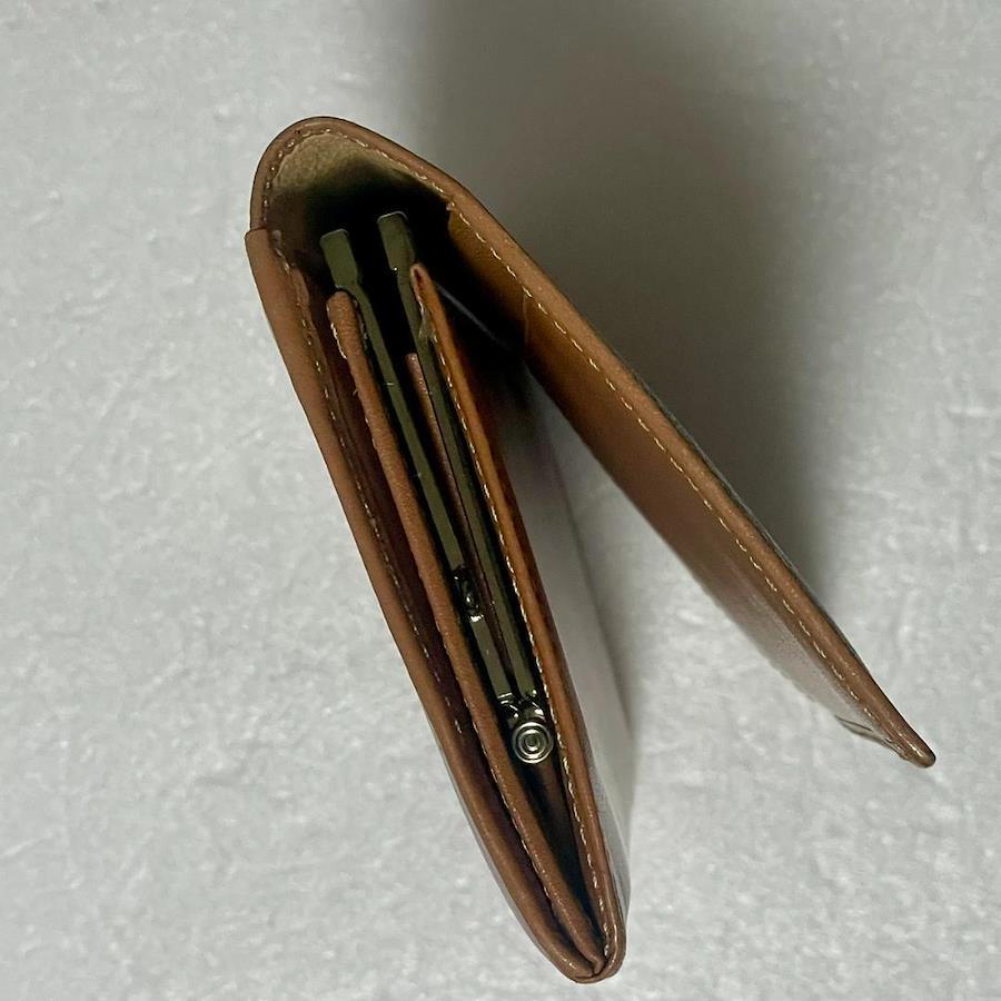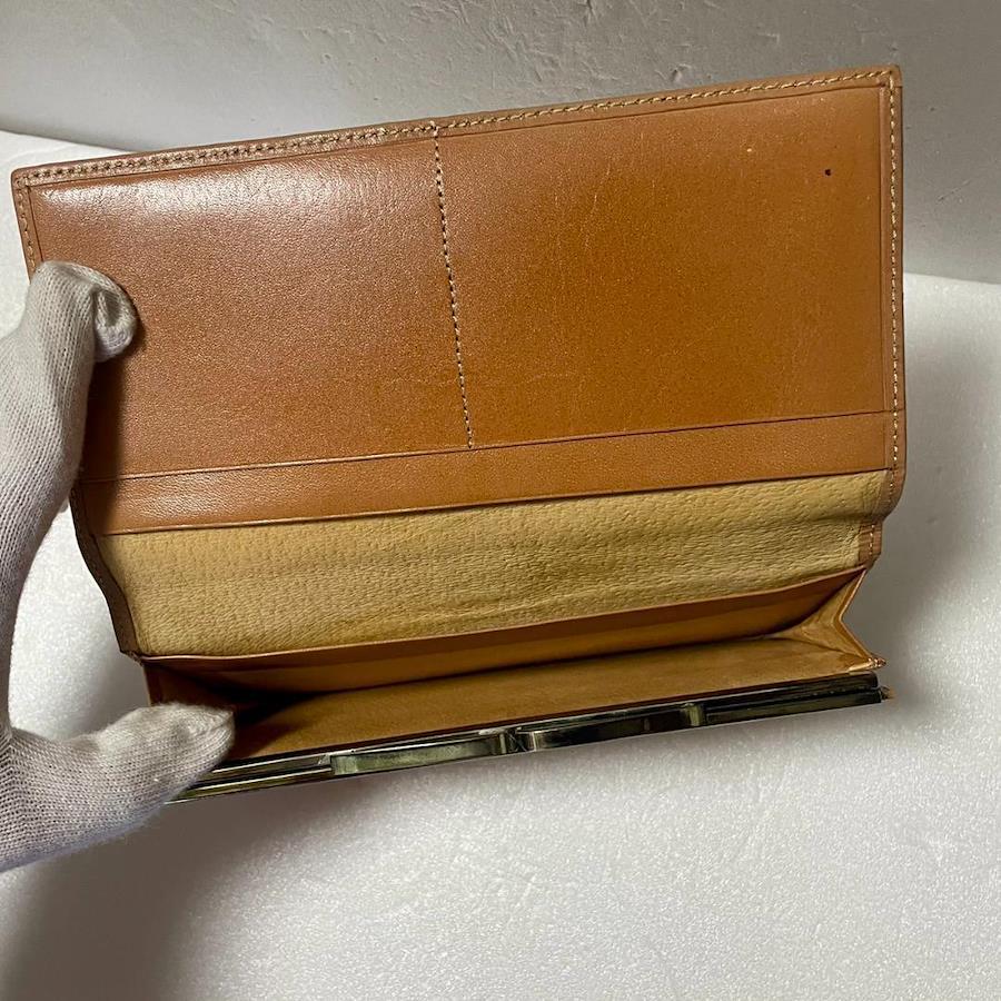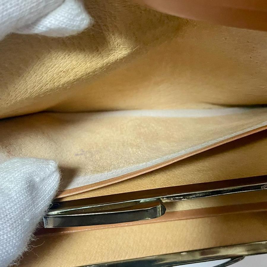 小銭入れの中は、がま口の金具付近に若干の黒ずみが見られますが、目立つ汚れは少ない状態です。内側の布部分(スエード調の部分)に、毛羽立ちやごくわずかな薄いシミが見られます。がま口の銀部分に使用感があります。