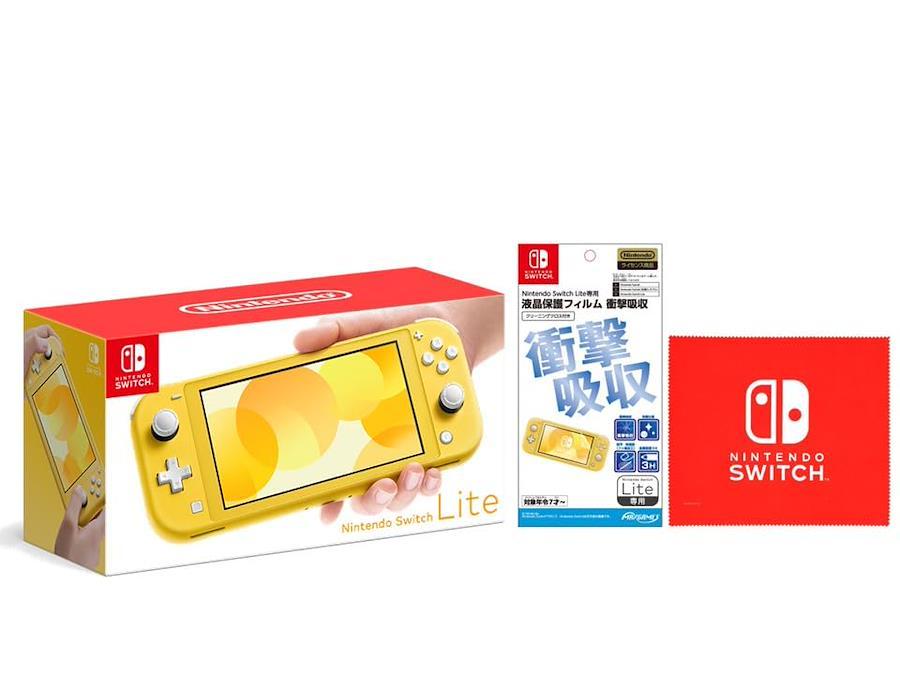 【セット内容】 ・Nintendo Switch Lite本体 ・Nintendo Switch ACアダプター ・セーフティガイド ・【任天堂ライセンス商品】Nintendo Switch Lite専用液晶保護フィルム 衝撃吸収 ・【限定特典】Nintendo Switch ロゴデザイン マイクロファイバークロス 型番:2200630141434 (C) Nintendo Nintendo Switch Lite イエローと【任天堂ライセンス商品】Nintendo Switch Lite専用液晶保護フィルム 衝撃吸収のセットです。 いつでも、どこでも、誰とでも。「Nintendo Switch」は、さまざまなプレイシーンにあわせてカタチを変えるゲーム機。 いつでも、どこでも、気の向くままに。自由なプレイスタイルでゲームを楽しむことができます。 従来品と比べて、タッチスクリーンの操作性とフィルムの透明性が高まり画面への影響が軽減しました。 【衝撃吸収】衝撃吸収層(ウレタン層)が画面への衝撃をやわらげます。【防汚・防指紋(フッ素加工)】フッ素加工により指紋や皮脂等の汚れが付きにくく、簡単にふきとれます。【抗菌仕様】抗菌加工により、フィルムを清潔に保ちます。※雑菌の繁殖を完全に防ぐものではありません。【鉛筆硬度3H】鉛筆硬度3Hのハードコートにより、フィルムが傷つきにくい仕様です。【クリーニングクロス付き】付属のクリーニングクロスは東レ製です。