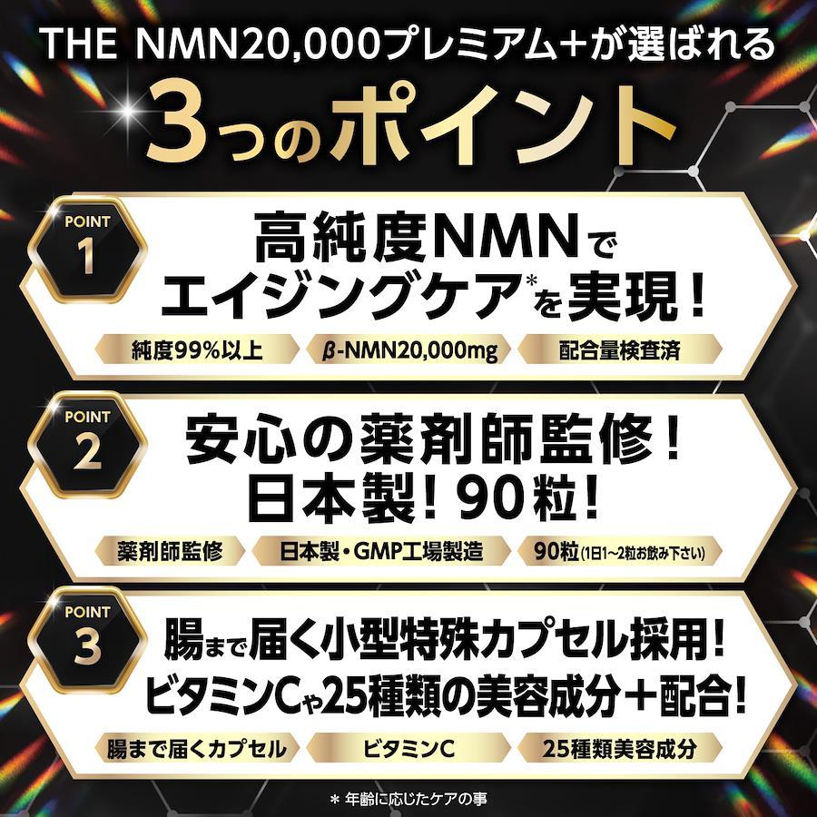 ■サイズ:??21.6x15.6x2.2cm;100g ?【NMN20,000mgで次世代エイジングケアを実現!純度99%以上!臨床試験実施!薬剤師監修】 ?【THE NMN20,000プレミアム+は日本製!純度は第三者機関で分析済み!酵母発酵法β-NMN!二酸化チタン不使用!GMP認定工場製造!90日分】 ?【腸まで届く小型特殊カプセル採用で純度をそのまま吸収!NMN20,000プレミアム+は栄養機能食品!ビタミンCや25種の美容成分をプラス配合】 ?【エイジングケアされたい方、いつまでも綺麗な自分でいたい方、美容サプリを探している方、元気な毎日を送りたい方にオススメ!1日1粒飲むだけだから簡単】 ?【純度99%以上!1箱あたりβ-NMN20,000mg配合!90日分!GMP認定工場製造!腸まで届く特殊製法!薬剤師監修!日本製】 ■重要なお知らせ原材料・成分β-ニコチンアミドモノヌクレオチド(国内製造)、デキストリン、レスべラトロール含有赤ワインエキス末、ユーグレナ末、サケ鼻軟骨抽出物(非変性II型コラーゲン・非変性プロテオグリカン含有)、豚ブラセンタエキス末、ローヤルゼリー 末、クロレラ原末、コエンザイムQ10、αリポ酸、とうもろこしエキス末(セラミド含有)、コラーゲンペプチド(ゼラチンを含む)、ビオチン含有酵母/HPMC、ステアリン酸カルシウム、微粒酸化ケイ素、ゲル化剤(ジェランガム)、ヒアルロン酸、ピロリン酸第二鉄、ビタミンC、ビタミンE、ナイアシン、パントテン酸カルシウム、ビタミンB1、ビタミンB6、ビタミンB2、ビタミンA、葉酸、ビタミンD、ビタミンB12