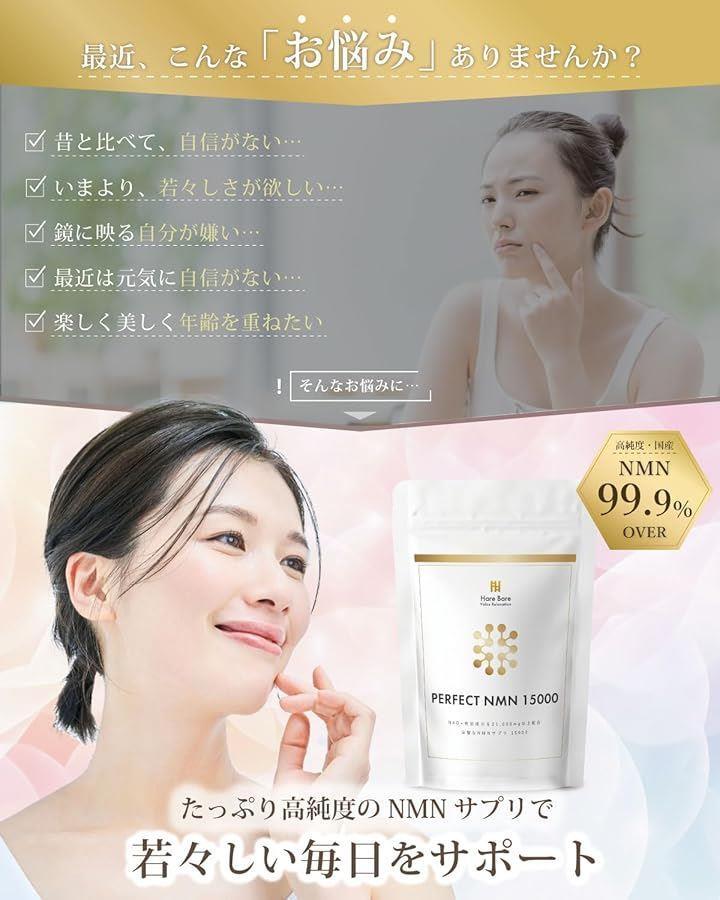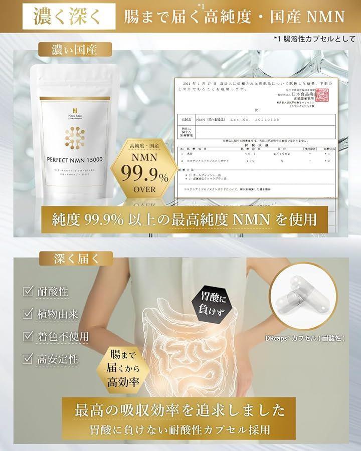 「高純度の国産NMN」1袋に高純度(99.9%以上)の国産のβ-NMNを15000mg配合しています。