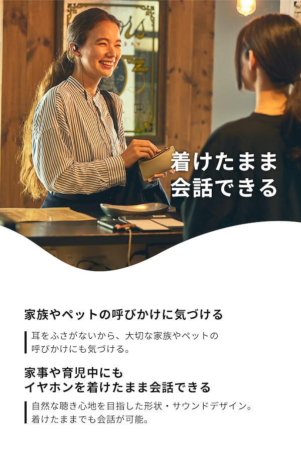 【周囲の人と会話できる】耳をふさがないから、音楽を聴きながらでも自然に周囲の人と話せます。レジで会計する際に気を遣ってデバイスを外す必要がなく、車が近づいてくる音にも気づくことができます。